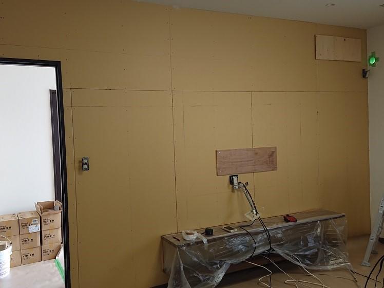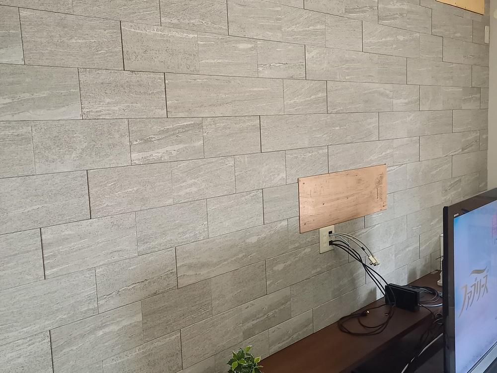 そこで、テレビ側の壁に、快適な空間をつくる人気の壁材「エコカラット」を施工することになりました。