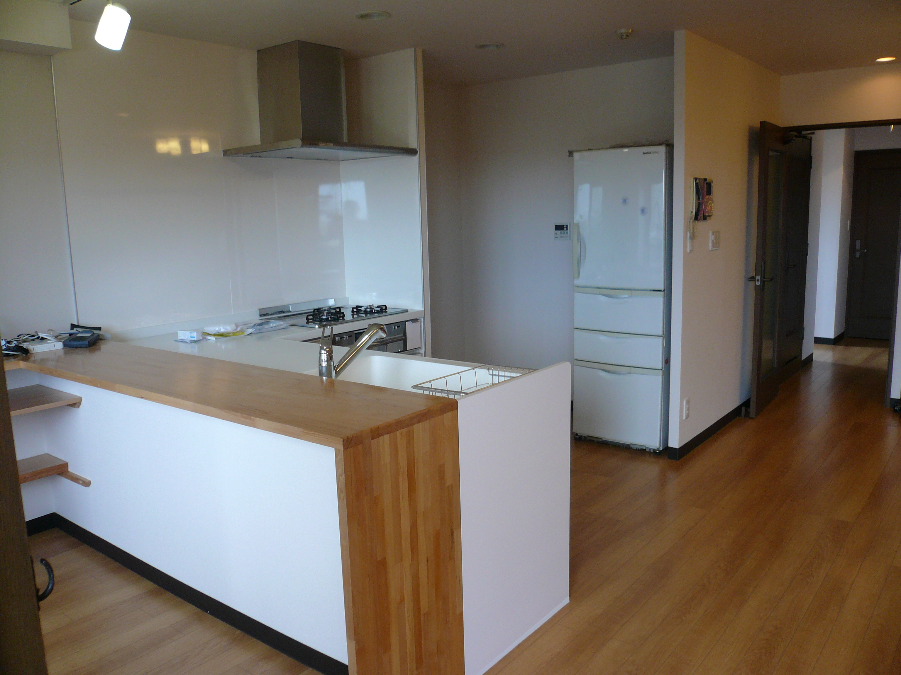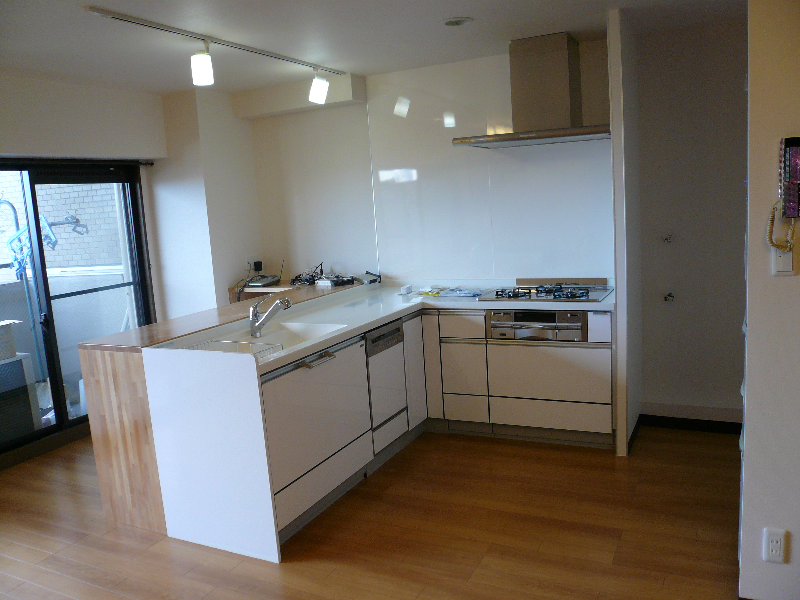 L型キッチンに対面カウンターをつなげることで、スペースも広くなり開放的で明るい雰囲気のキッチンになりました。