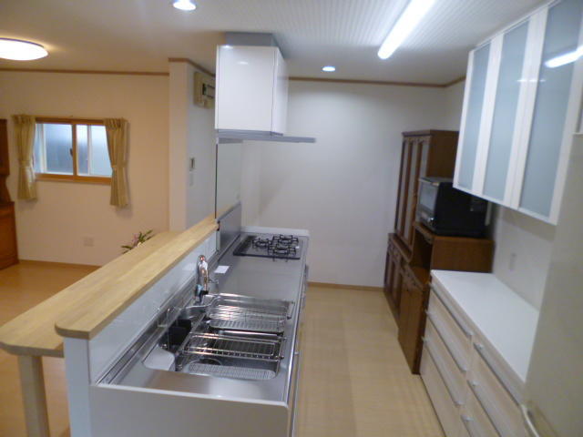 キッチンの壁の向こう側に理容室があった為、そのスペースを利用して、LDKを広く快適に使えるような、間取りを考えました。 また、奥様の為の引き出し付きデスクカウンターと、開き戸収納を、ご提案しました。 冬の寒さ対策に、インプラスや断熱材を多く入れて、軽減できるようにしました。