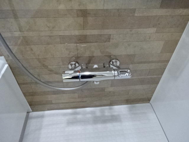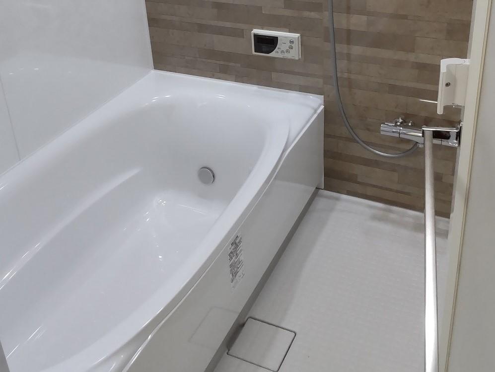 在来浴室からユニットバスへのリフォームは、断熱性や掃除のしやすさなどのメリットが大きいです。 今回お選びいただいた浴槽は、「ミナモ浴槽」といい、水面がどこまでも続くようなデザインで、心地よい全身入浴をかなえます。角が少ないので、お手入れもしやすいです。 お選びいただいたアクセントパネルも、とても素敵で落ち着いた空間になりました。
