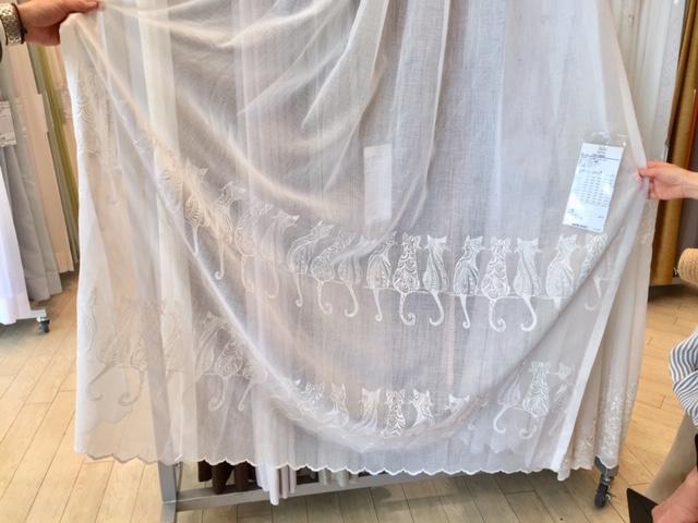 猫が刺繍されたレースカーテン。甘すぎないデザインで、リビングにも使えそうです。