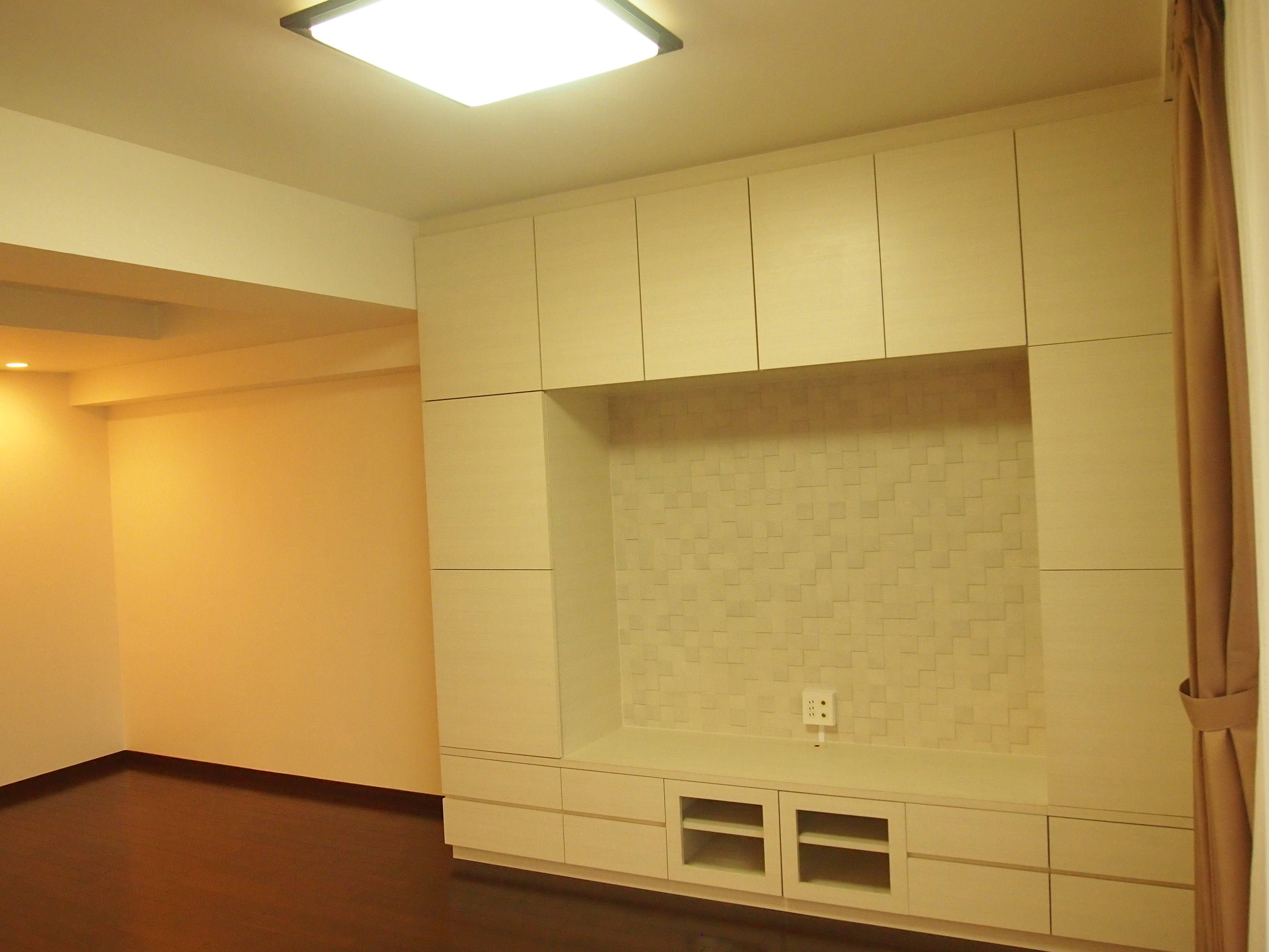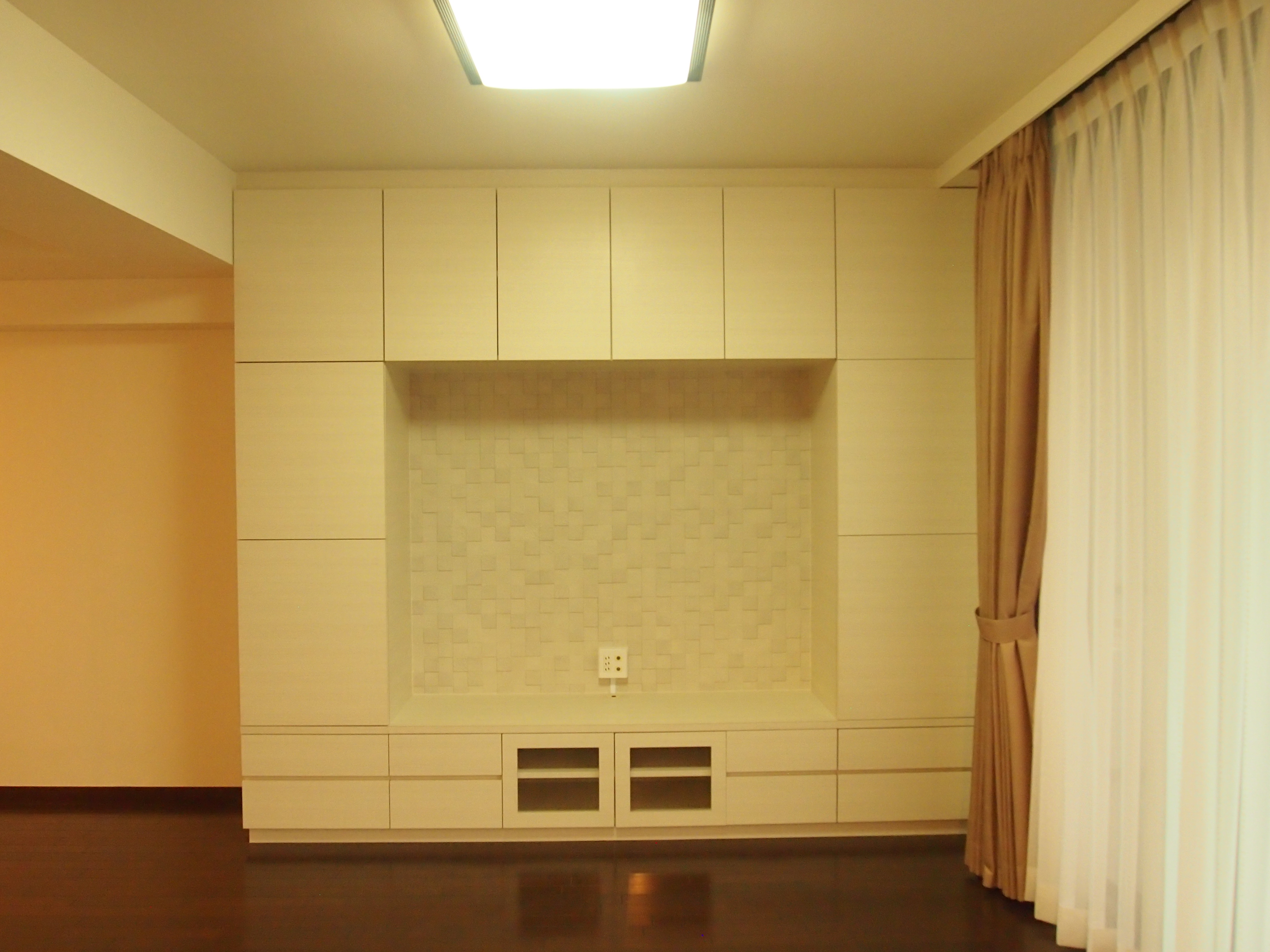 リビングの壁面収納は細かな寸法、既製品にはない面材でオーダーメイドです。