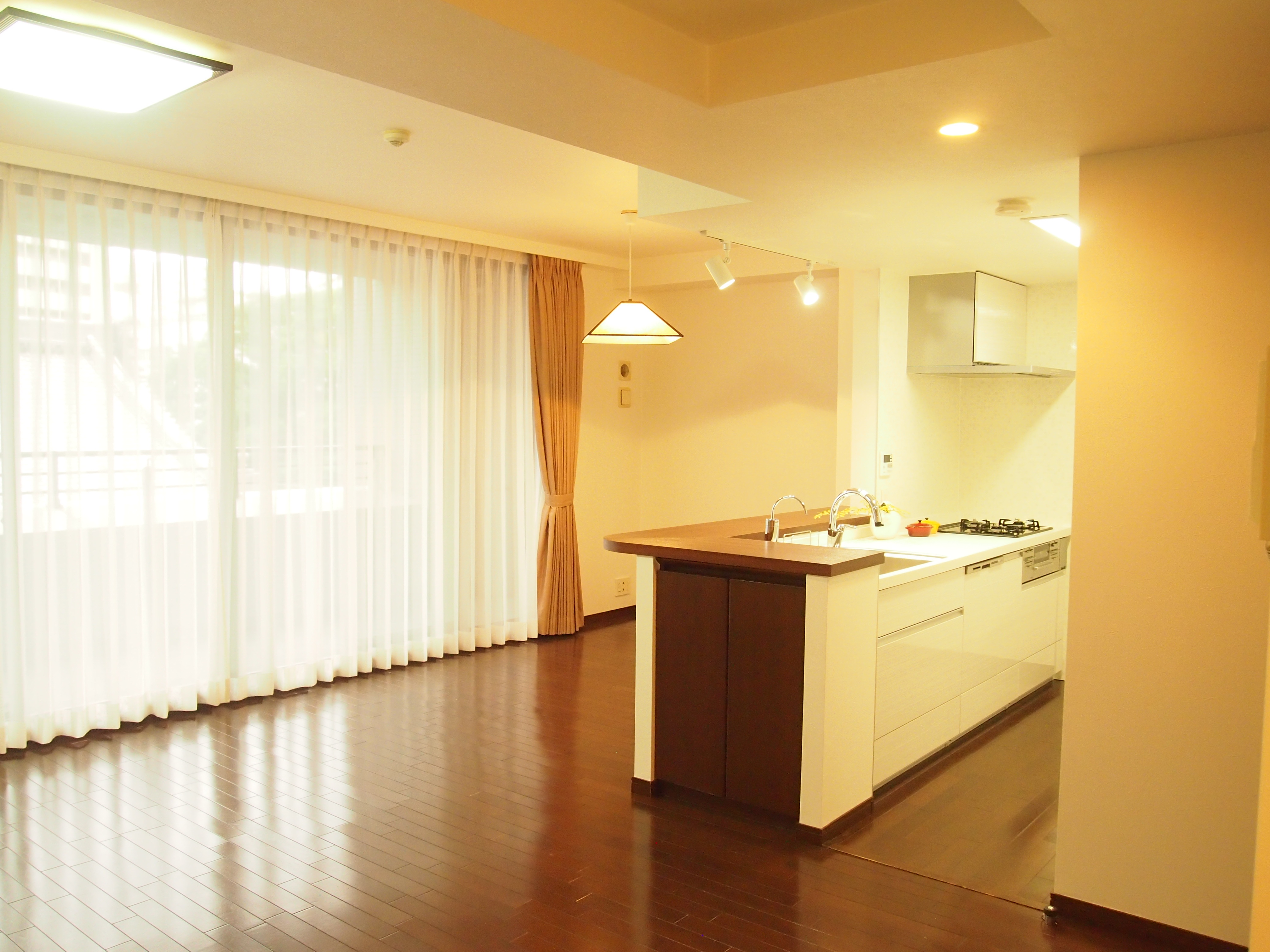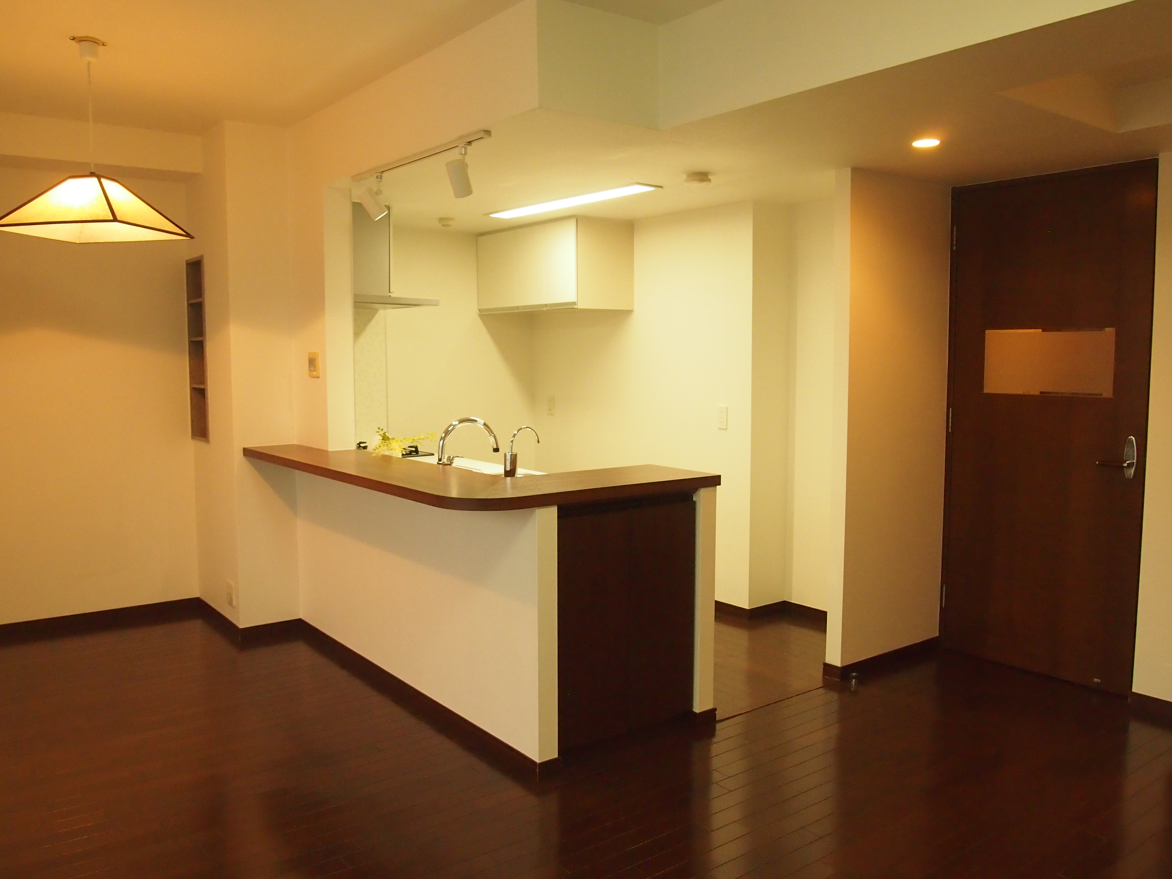 小さな開口部しかなかった少し暗めのキッチン。囲まれた壁を撤去し解放感ある明るいキッチンへ変わりました。上部の吊戸棚も無くしてスポットライトで手元を照らします。
