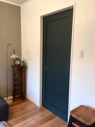 ドアは、LIXILのVINTIA(ヴィンティア)シリーズ。引き戸タイプで、開け閉めの時に邪魔になりません。洋室にも違和感無くマッチするデザインです。(※開き戸タイプもございます)また、上部で吊る施工なので、床に敷居や桟などが無くフラットなので、ゴミや埃が溜まりません。お施主様のお持ちの家具と、ヴィンテージ感のあるドアが引き立て合っています。