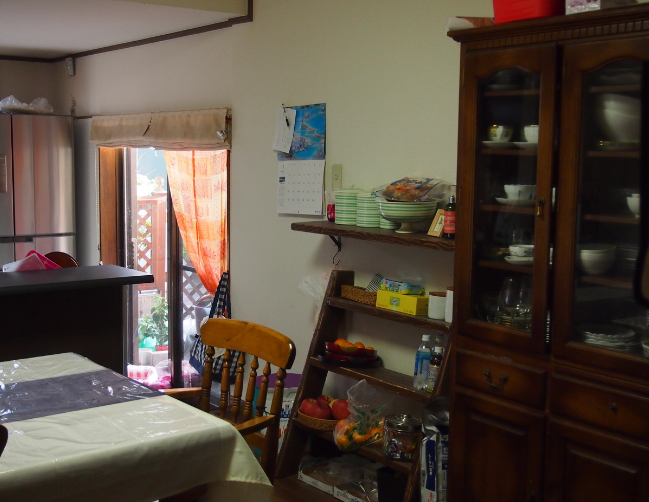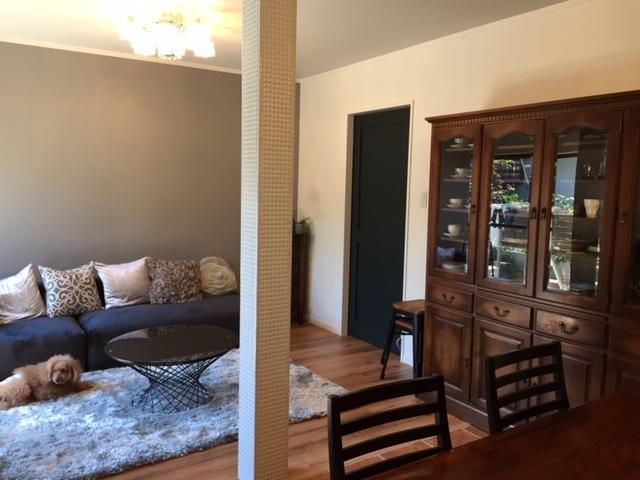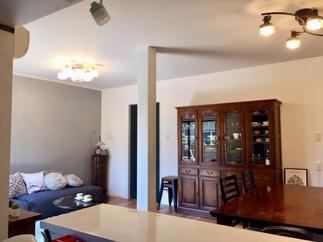 キッチンから見た風景。柱のある位置が、以前間仕切り壁があったところです。大きな食器棚も余裕を持って配置出来るようになり、また重厚なデザインが映える空間になりました。そしてリビングの1面のみ、グレーの壁紙に。差し色を入れることで空間にメリハリを出し、画像では分かりづらいのですが、少しラメの入った壁紙なので、高級感も出ました。お施主様セレクトの照明が、素敵です。
