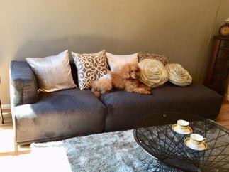 大きなソファも余裕で置けるリビングに。部屋をひと続きにしたことでLDKの窓が増え、ペットのワンちゃんもお気に入りの陽当たりのいい空間になりました。
