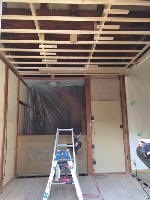 間仕切り壁を撤去。天井や床のレベルをダイニングに合わせます。