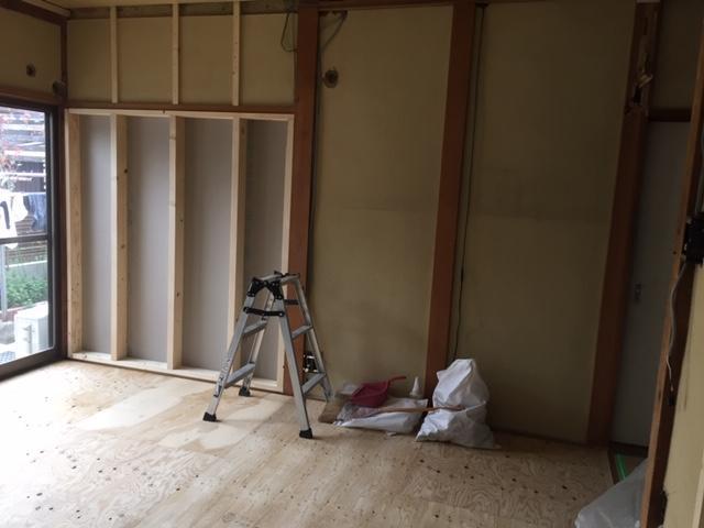 隣室にあった襖を塞ぐため、間柱を立てて壁を作ります。床材はLIXIL『ラシッサ』を貼りました。見た目は天然木のような仕上がりながら、傷や汚れに強い加工が施された、いいところ取りの床材です。