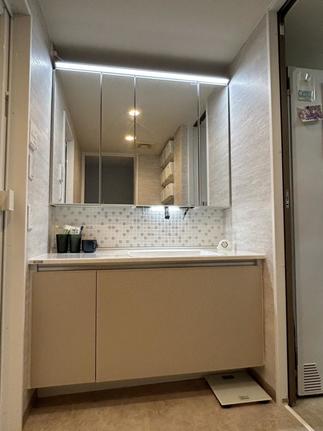 LIXIL『ルミシス』をご採用頂きました。洗面ボウルを片側に寄せて、手洗いや歯磨きをする方と、お化粧をされる方、2人同時に使いやすく。タッチレス水栓とタッチレススイッチの照明が搭載されていますが、お施主様には、とくにタッチレススイッチ照明を、「とても便利」と喜んで頂けました。※タッチレススイッチ照明は、『ルミシス』のみお選び頂ける機能となります。