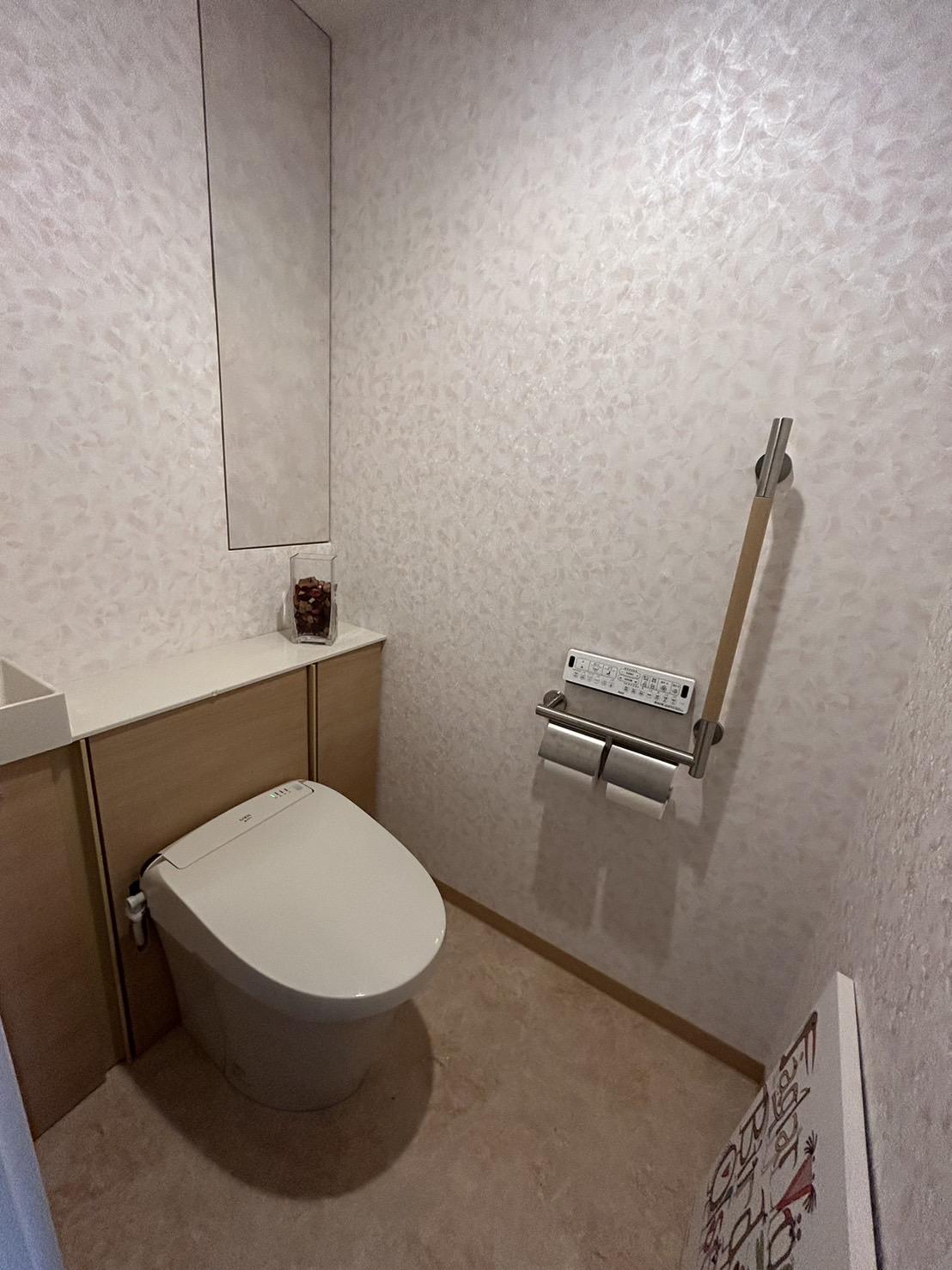 既設は、タンクに手洗いが付いているトイレでした。キャビネットに手洗いがついた、LIXIL『リフォレ』(※現『Jフィット』をご採用頂き、トイレ裏をすっきり&手も洗いやすい形に。また、元々あったニッチ収納は、造作で扉をつけ中が見えず、また埃が溜まらないように。手すりも付けて、立ち座りも安心です。