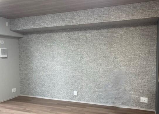 背面のグレーの壁紙と、落ち着きのある木目
