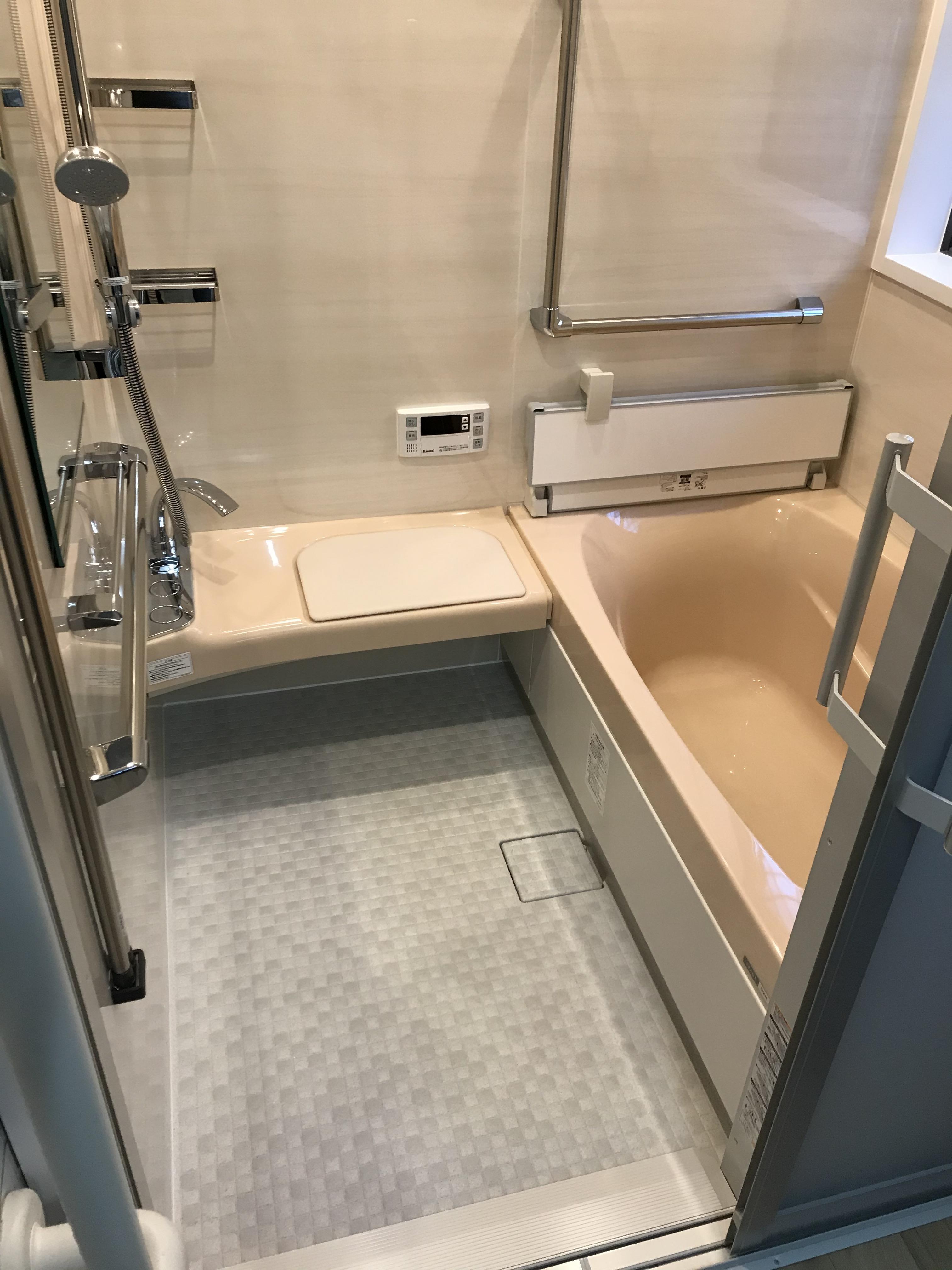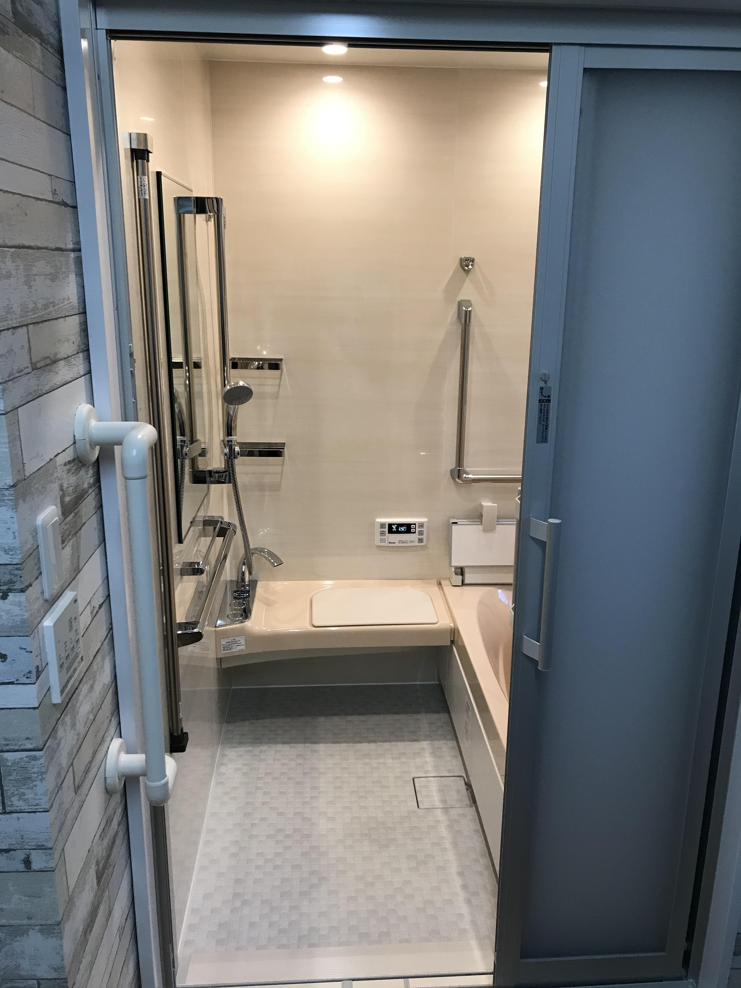 離れに住むご年配のお母様の為に、浴室を新設しました。 離れにお風呂がなく不便でしたので、廊下と押入を取り壊して浴室をつくりました。 体が不自由になってきているお母様を配慮し、ゆったり座れるベンチや、つかまれる手摺を設置し細かなところまで気を使っています。 【LIXIL/スパージュ】