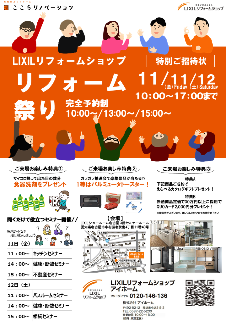 年間1万組が来場されるLIXILショールーム名古屋にて、LIXILリフォームショップリフォーム祭りを開催いたします。