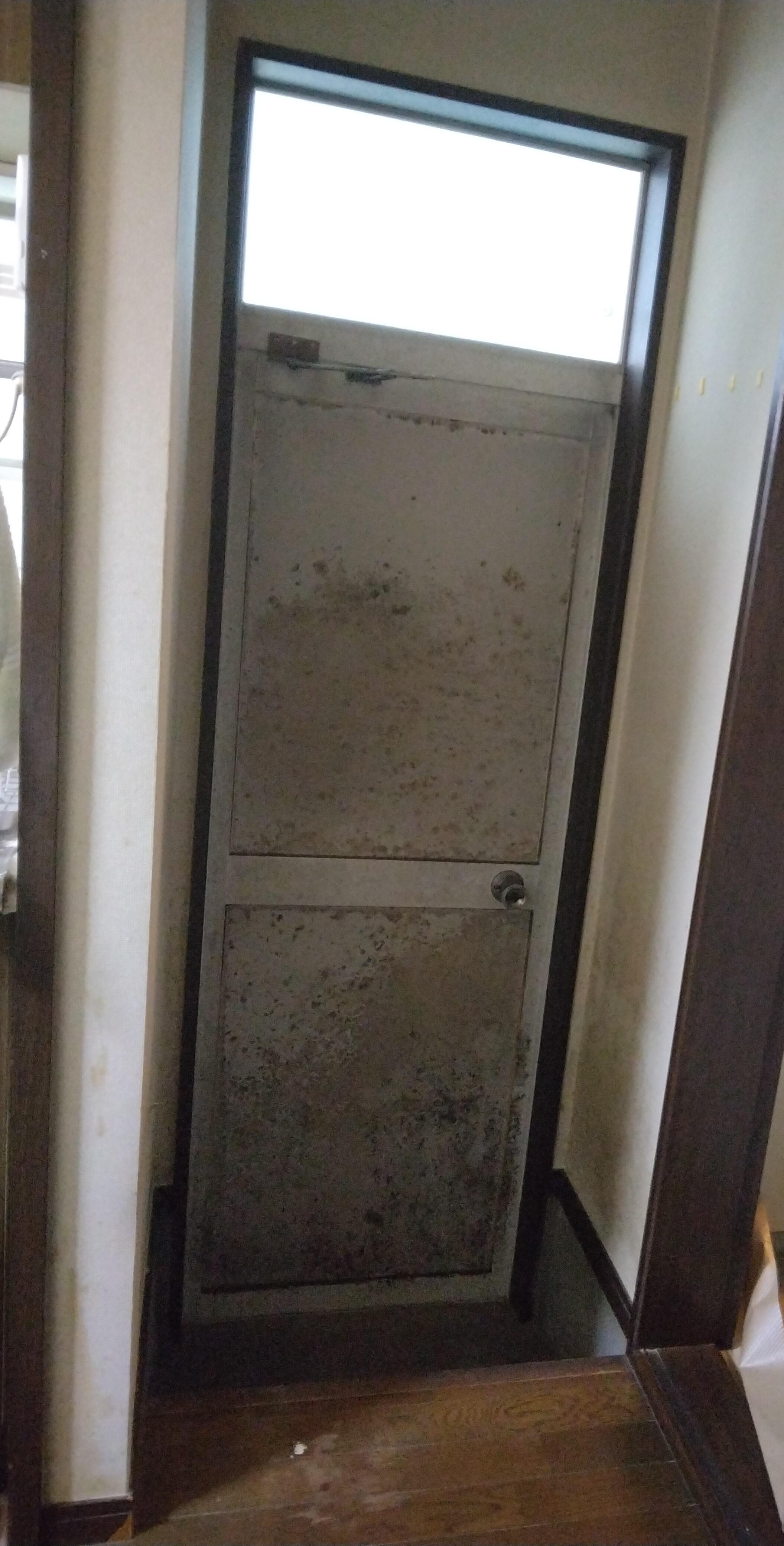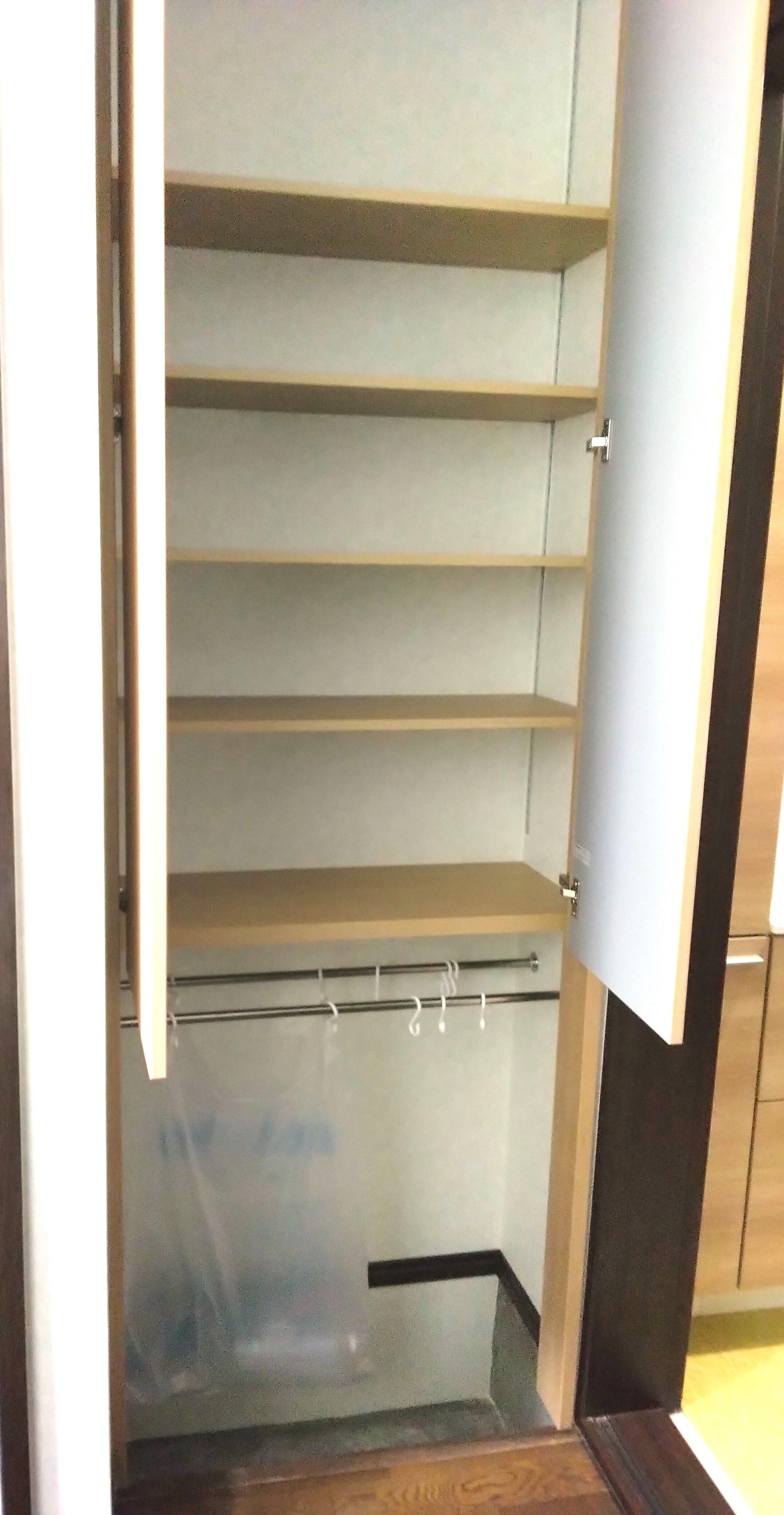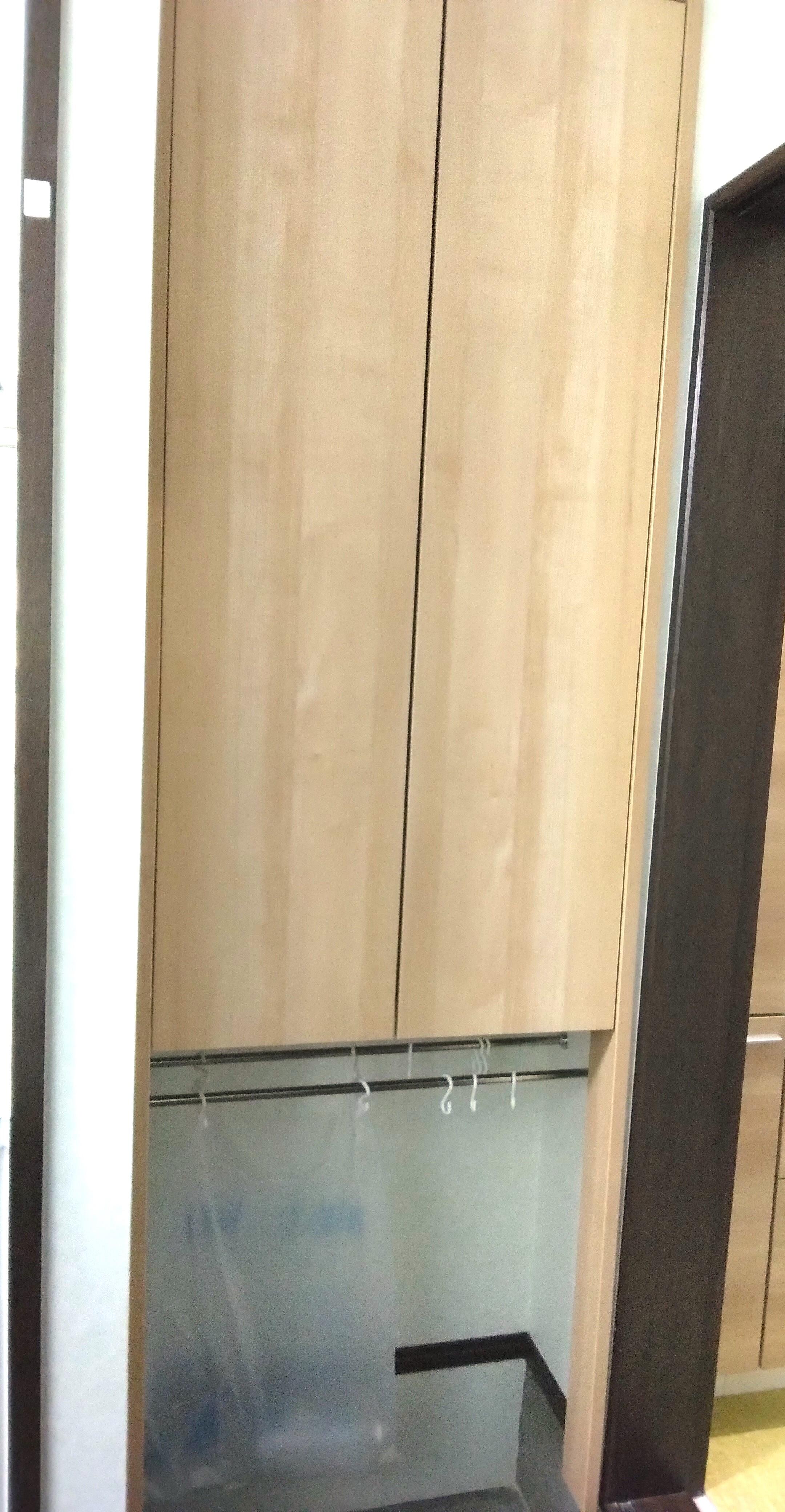勝手口を収納にされたいというご依頼でした。 勝手口ドアを塞ぐ形で新しく壁を立てて、 上部を扉付きの可動棚収納、下部は、ハンガーパイプにゴミ袋を吊るし、分別ごみ用のスペースに。
