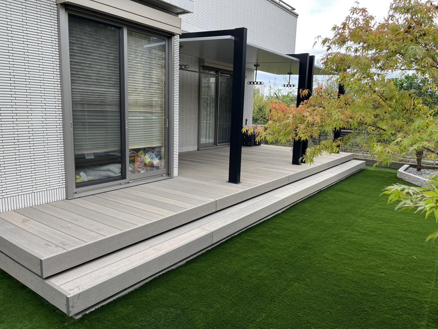 LIXILテラスSCを2連棟で設置し、デッキDSを組み合わせています。 広々とした屋根付きデッキ空間が生まれ、使い勝手とデザイン性を両立しました。
