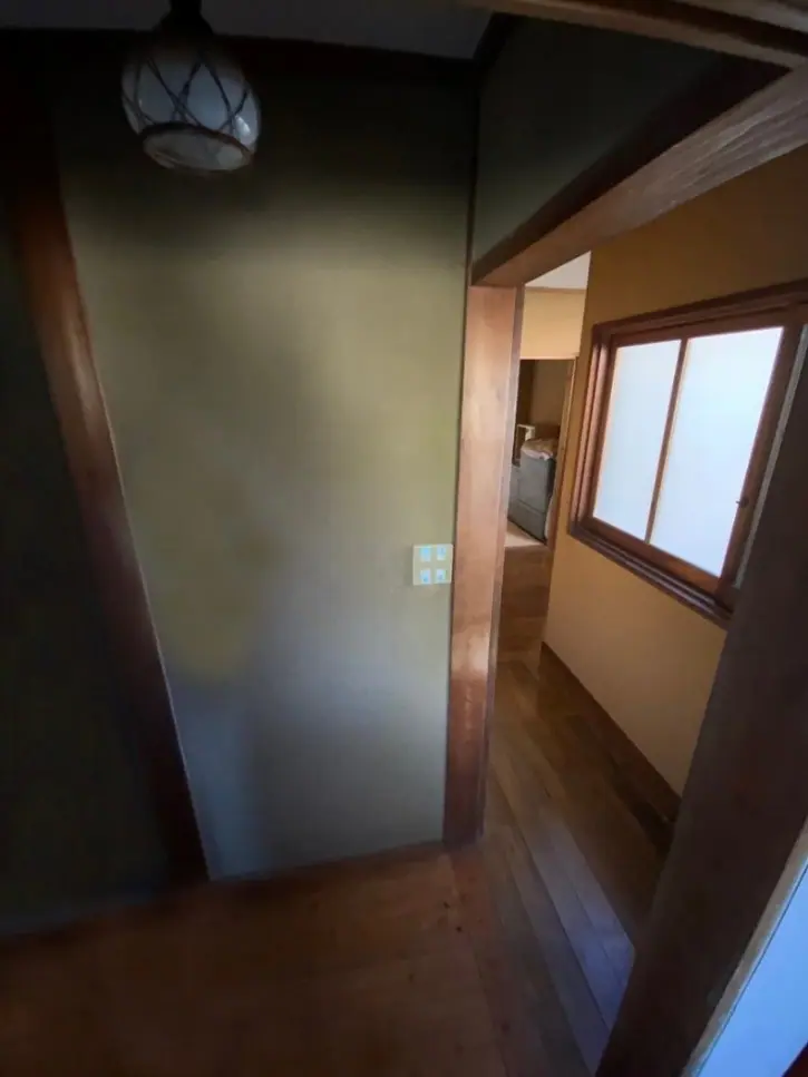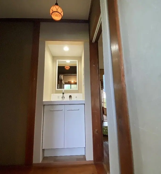一枚目の写真の壁の向こう側は階段裏となっております。今回は、壁を壊し階段裏のスペースを活用して洗面化粧台を取付けました。廊下にはみ出ることなく収めることが出来たため、通路の妨げになることもなくスッキリとしています。