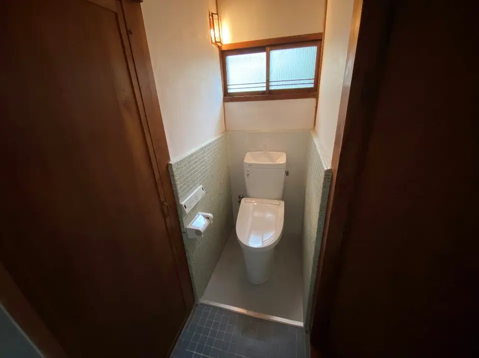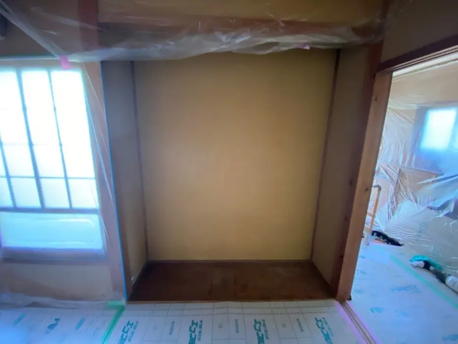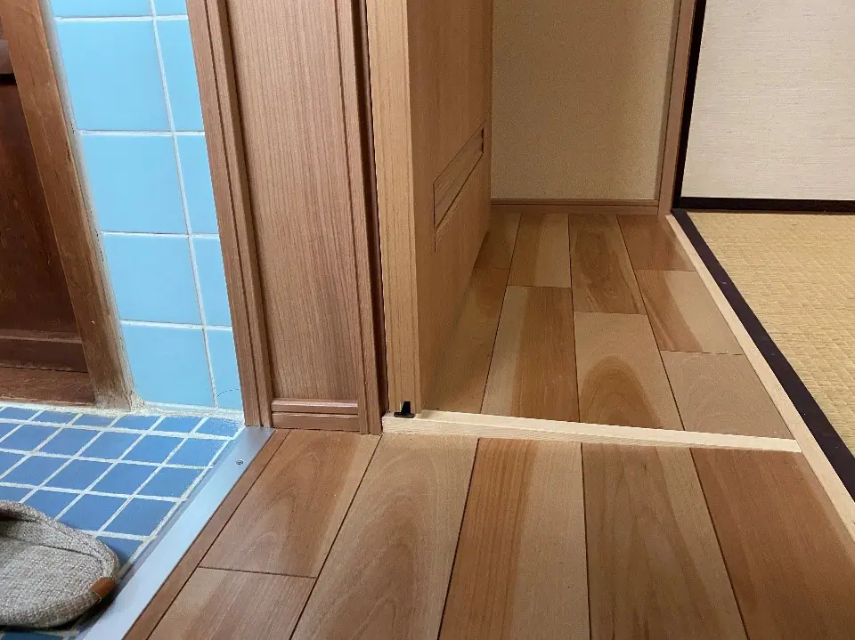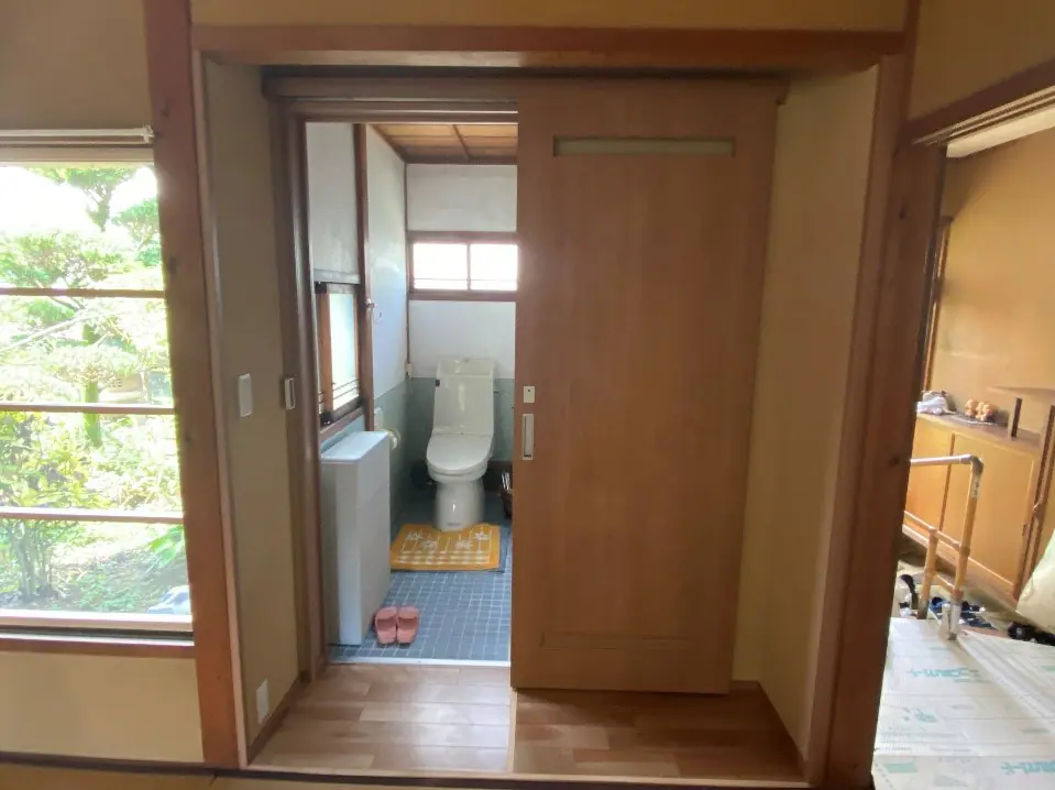 この壁の裏側には左側に洋便器、右側に小便器がありました。片方の小便器も洋便器へと変更しました。また、和室からトイレへの出入りを可能とするために、床の間の壁を一部撤去し引き戸設け、高齢のご夫婦の寝室となっているこちらの和室から、なるべく短い同線でトイレに行くことを可能としました。そして床は、段差をなくす為にスロープを設けました。