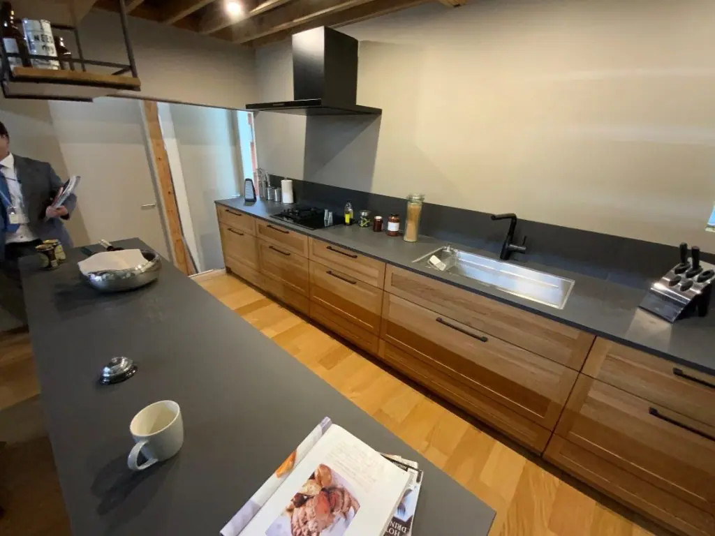 ニュージーランドで30年かけて育てたパイン材を使って製作したキッチンは 、本物の木ならではの豊かな表情を活かしたデザインで、シンクの下にゴミ箱用のスペースが確保され料理をしながら移動せずにごみを捨てることができるのも良いですね。