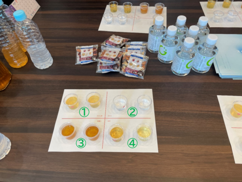 左上から①みかん酢 ②ポカリ ③味噌汁 ④麦茶 になります。