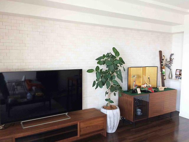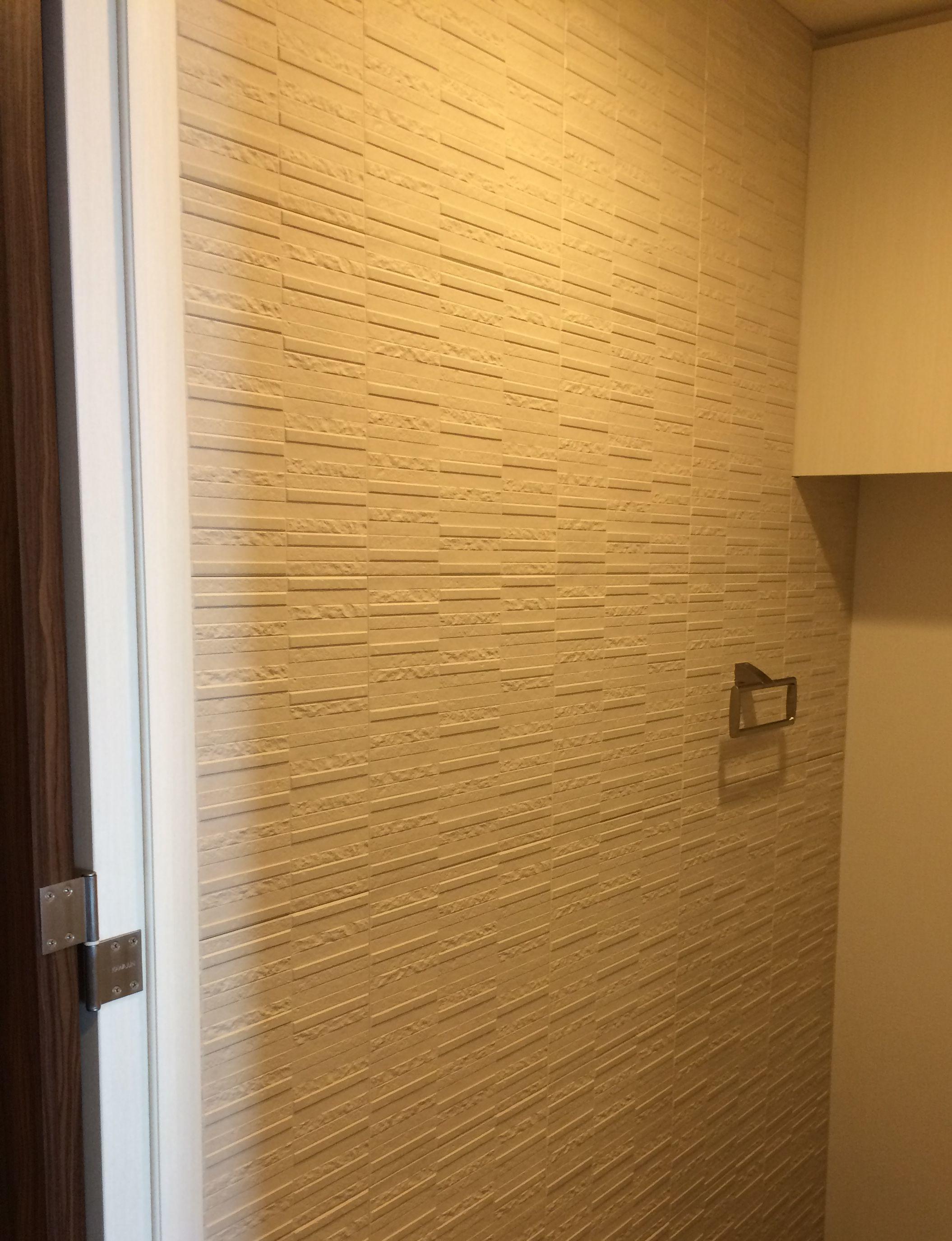 リビング及びトイレの壁にエコカラットを貼らせて頂きました。エコカラットは調湿、脱臭、有害物質の吸着・低減の機能があるLIXILのタイルです。デザイン性も高くリビングにはエコカラット『ヴィスト』