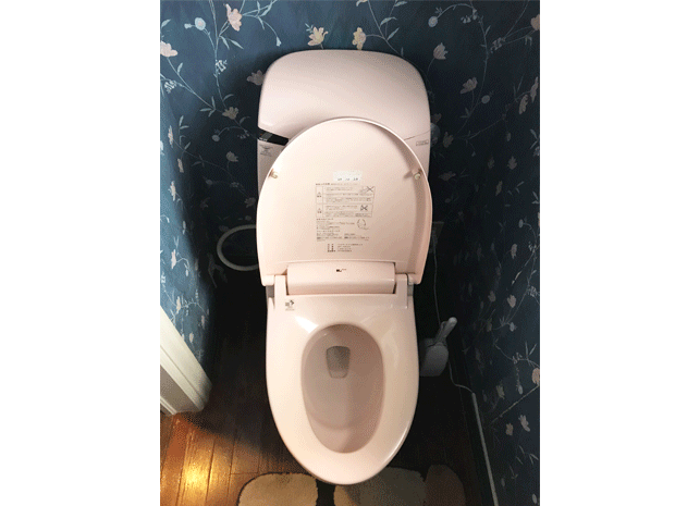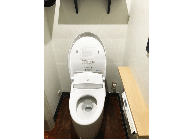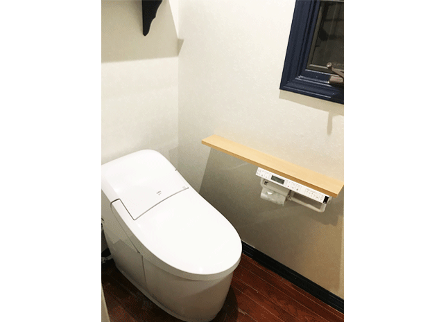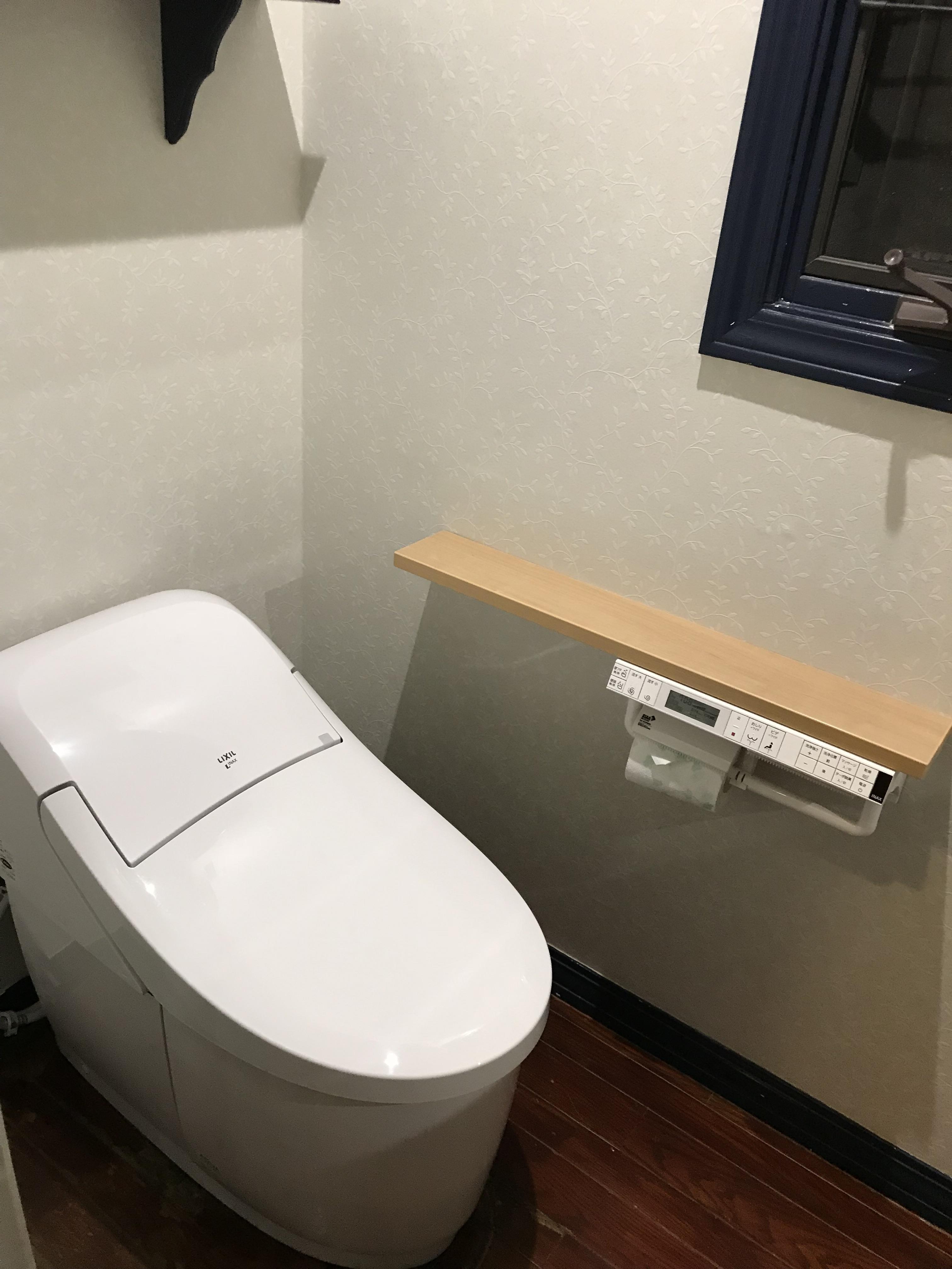 2階トイレの壁、天井クロスを優しい雰囲気に仕上げ、長年ご愛用されたスタイリッシュな空間から、心が安らぐ空間へと一新しました。誰もが使いやすいデザインにこだわった『LIXIL プレアスLS』をご採用いただき、コンパクトでゆとりのある空間を演出することができました。手すりを設置したいけど、スペースが取れないというご要望から、セットの棚手すりをご提案させていただきました。ペーパーホルダーとインテリアリモコンが一体となった棚手すりはお施主さまに大変ご満足していただくことができました。
