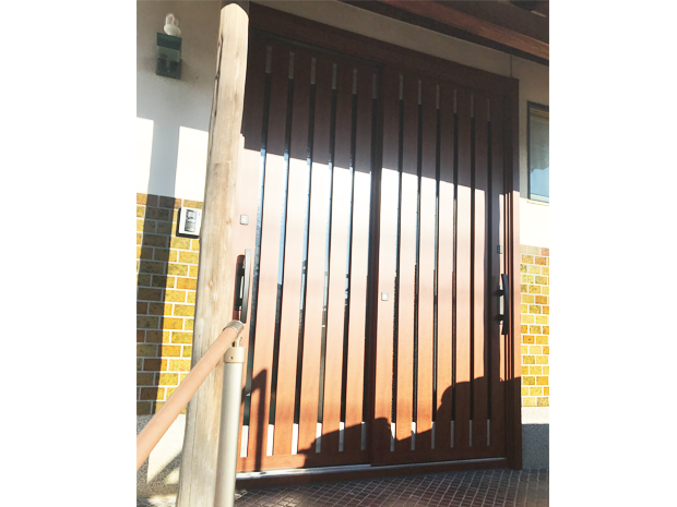 玄関扉の取替え工事を行いました。築40年経ち、経年の傷みを気にされてご来店いただきました。開き戸を引き戸にすることで開け閉めが軽くなりました。縦スリットのデザインにすることで明るさも確保し、外観の雰囲気を損なうことなくイメージチェンジすることができました。LIXILのリシェントであれば玄関扉の取替え工事はおよそ1日程度で行うことができます。