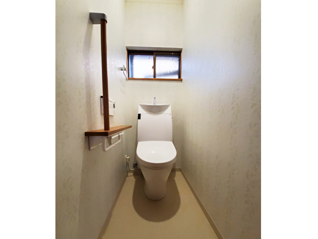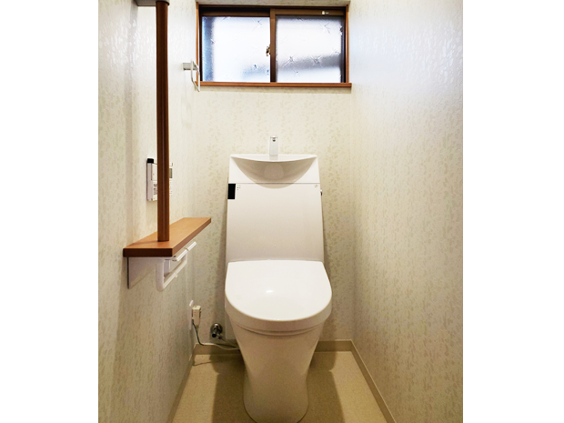 また、手すり付きのペーパーホルダーに変えたことで立ち上がりの際の転倒防止にもなります。和式トイレから洋式トイレにするには、床下の配管から変える必要があるので、床の解体・床組を行います。また、今回は天井・壁もクロスに張り替えたので工事期間は5日間でした。