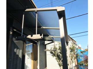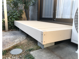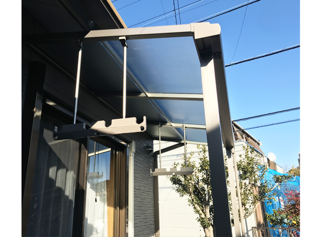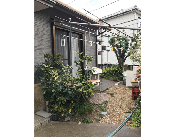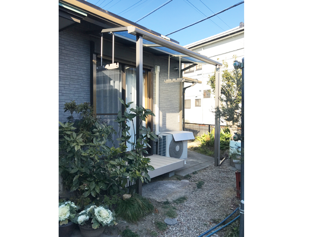 ご主人様自作の物干しを使用していたお客様。屋根がなく、雨の日は洗濯物が干せないため「ちょっとした雨の日でも洗濯物をほしておきたい」とのご要望で、ウッドデッキとテラスの施工をさせていただきました。