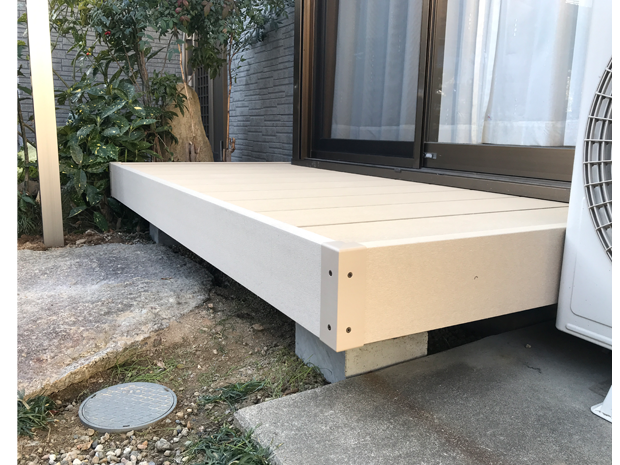 ウッドデッキはLIXILの『樹ら楽ステージ』、テラスはLIXILの『スピーネ』をご採用いただきました。