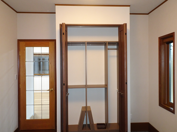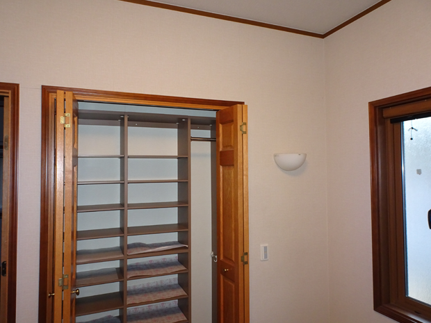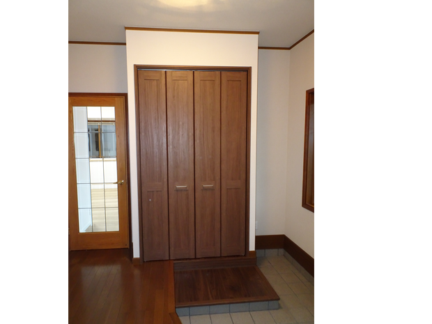 中の棚板やハンガーパイプはそのまま再利用で扉の交換と配置の変更をしました。隣にあるドアから入った室内側へつくられていたシューズクローゼットを玄関側へ出し、部屋を広く使えるようにご提案させていただきました。(部屋内側の様子は「大規模リフォーム④にて紹介しております)ドアは室内側のリフォームに伴い、使い心地の良さを検討した結果、吊元を反転させています。