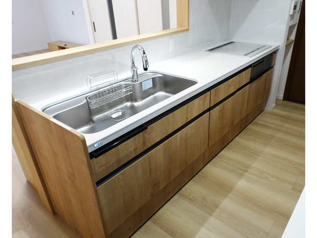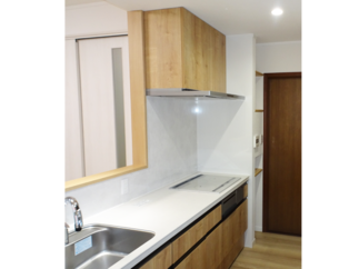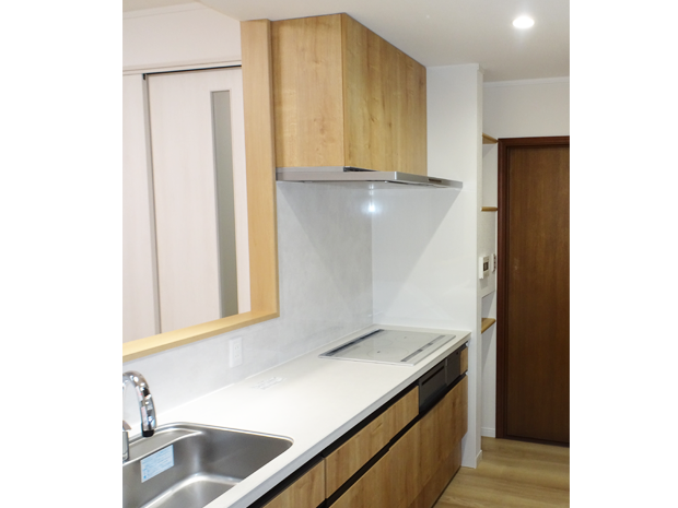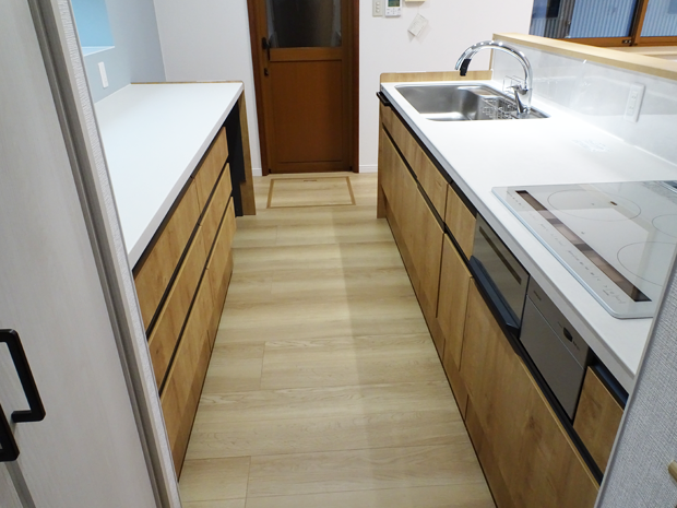 システムキッチンはLIXILの『リシェルSI』を採用していただきました。キッチンと同じ木目のデザインをレンジフードまで統一することが可能です。奥様のご要望でキッチンパネルはマグネットが付く『不燃マグボード』を使用しており、レシピやお買物メモにお役立ちです!