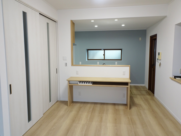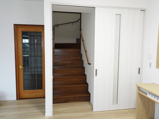 カップボードの近くにはコンセントを設置。家電の配線問題もこれで解消ですね♪吊り戸をつけていないのでアクセントクロスの淡いブルーが爽やかで印象的です♪床材の『ラシッサD』との相性も抜群ですね。キッチン前にカウンターも設置し、お子様の勉強を家事の合間に見守ることができます!リビングイン階段には空調効率を上げたいということで、引戸を新設しました。