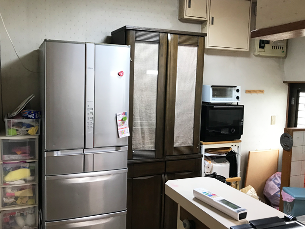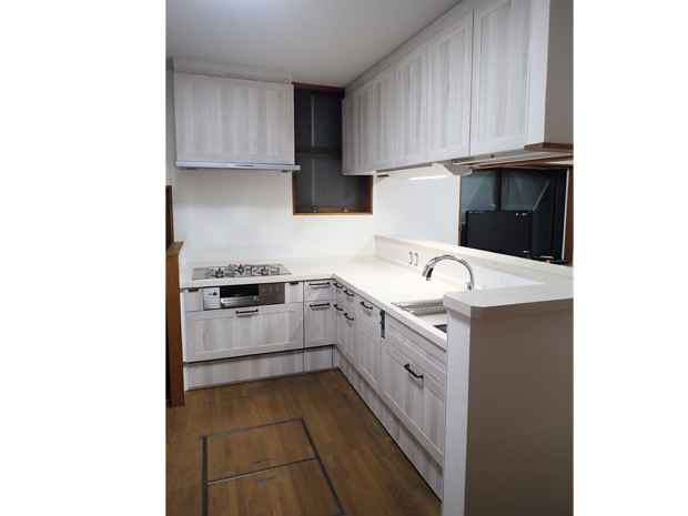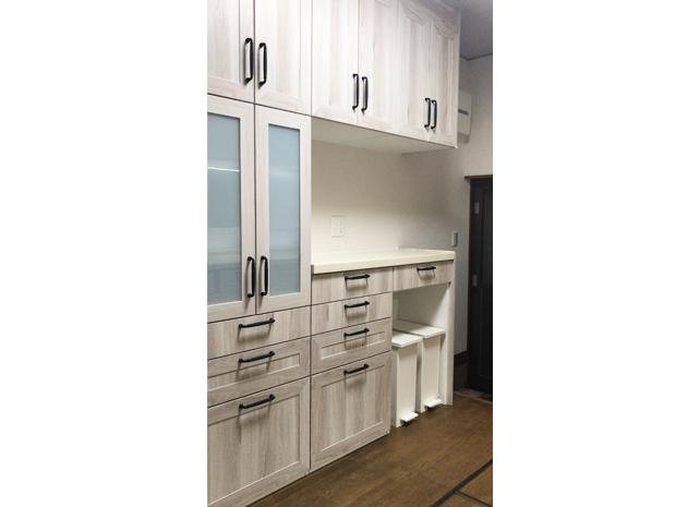 また、背面のカップボードの設置に伴い、ご自宅の建築当時からある電気配線のボックスを見直し、撤去しました。カップボードの大きさを広げることができ、食器や調味料などの収納スペースもしっかりと確保できるようになりました。
