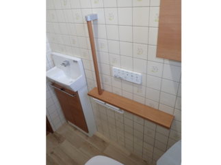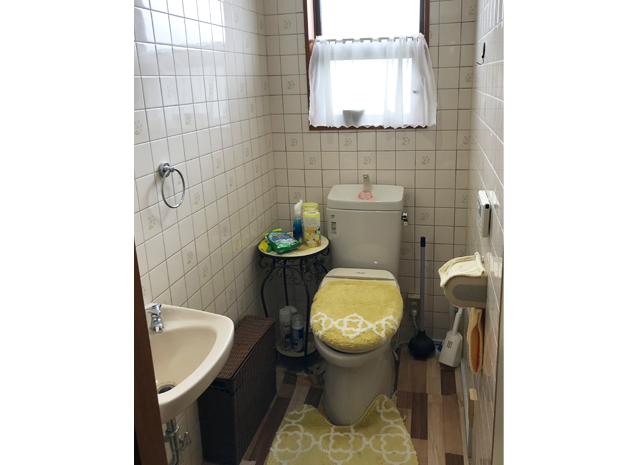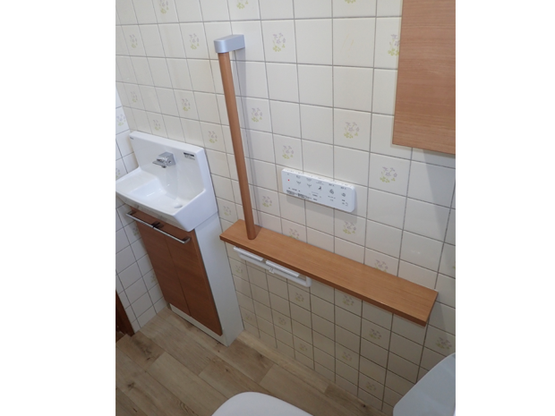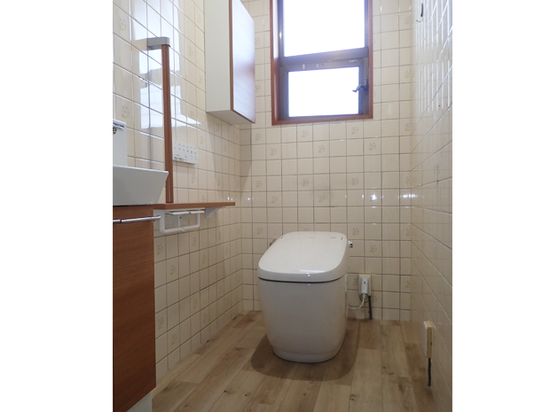 ご予算をお伺いし、壁面はそのまま残し、床タイル(施工前はDIYで木調のシートを貼られています)のみ仕上げました。その際、段差を解消する工事もあわせて行い、廊下からトイレへの出入りもスムーズになりました。