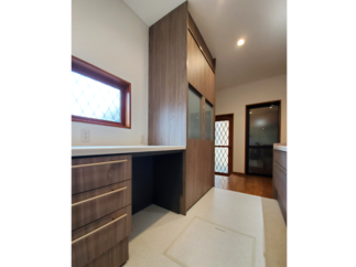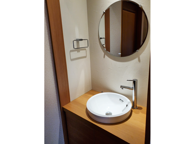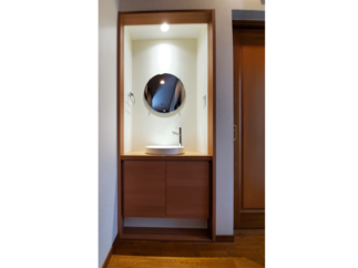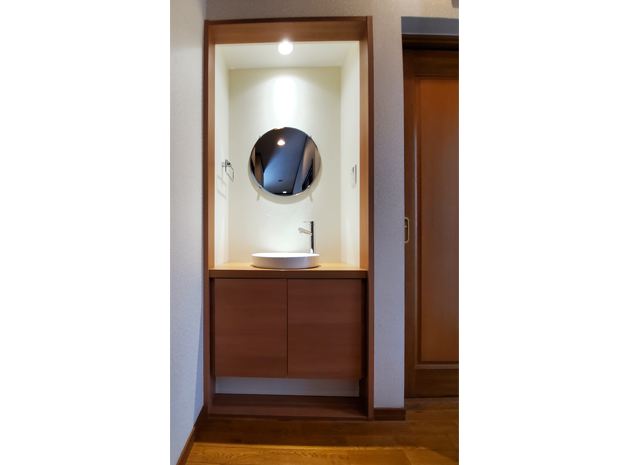 奥様より廊下に手洗いがほしいとご要望がありましたが、廊下に取り付けられるスペースがなかったため、収納として使われていた場所の内部に設置をご提案させていただきました。案をご採用いただき、収納内部にLIXILのエスタ(手洗い)を設置させていただきました。収納内部に取り付けることで収まりもよく、スッキリした素敵な手洗い場に仕上がりました。