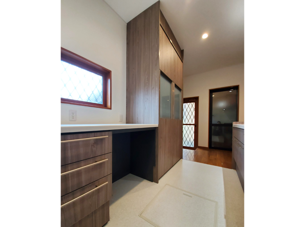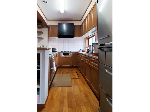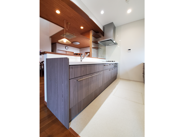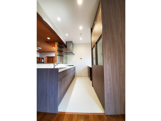 キッチンをコの字型からI型に変更、奥が使いづらい開き戸から使い勝手の良い引き出しに変更しました。また、スライド式扉のカップボードに取り替えることで扉の開閉で動線の邪魔になりません。キッチンはLIXILの最上級グレードであるリシェルをご採用いただきました。