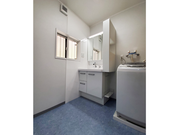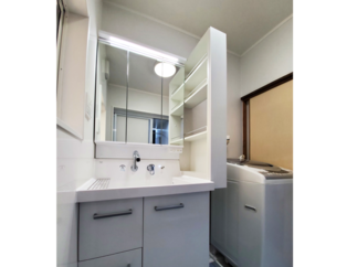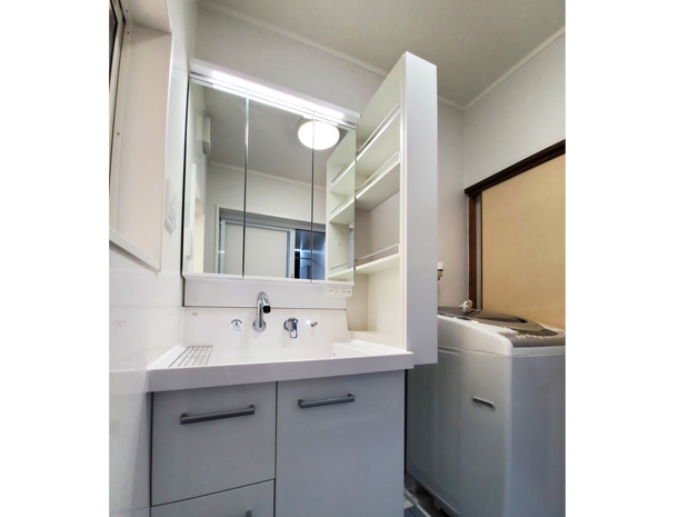 洗面化粧台はリフォーム前まで間口60㎝をご使用でしたが、間口75㎝へ取替え、さらに15㎝のトールキャビネットを設置しています。ゆったりとした広さになり、吊り戸を設置しなくても十分な収納量が確保できました!洗面化粧台横の壁面には水撥ねによる汚れ防止として、キッチンパネルとしても使用されるメラミン不燃化粧板をご採用いただきました♪