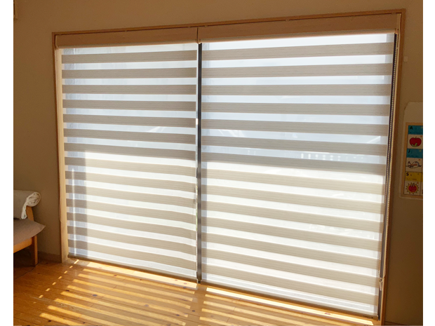 この商品はドレープとレースのボーダー生地を前後に2枚に重ねたもので、生地をスライドさせるだけで光の量を調節できます。ロールスクリーンを上げずに、お部屋の中のプライバシーも守りつつ、室内の明るさを調整することができます!