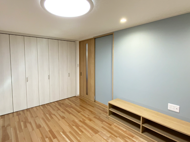 読書や勉強と落ち着いた雰囲気の空間としてお使いしていただけるように基本ベースを白、アクセントクロスに薄い青をご提案させていただきました。お孫さんが来た時に勉強にも打ち込むことが出来るように、造作家具で収納と勉強机も新設させていただきました。
