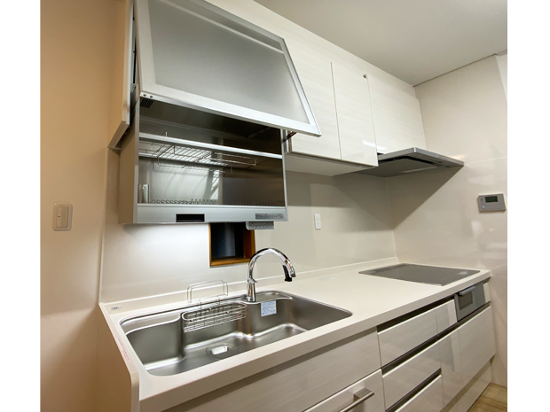 キッチン上収納には自動昇降式乾燥機を取り付けました。食洗機付きキッチンは収納が少なくなってしまうため収納を確保したい方にはおすすめの商品になります。