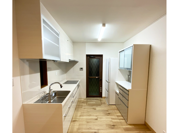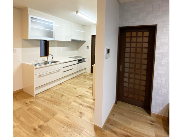 クロスは張り替え、床は重ね張り、建具も床に合わせて取り替えさせていただきました。LDKが一新されお孫さんとにぎやかに使用してもらえるのが楽しみです!