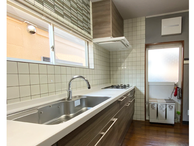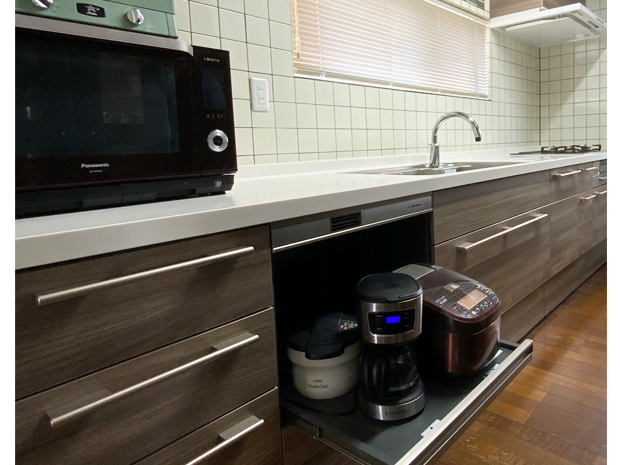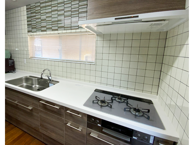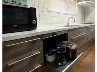 「開き扉タイプのシンク下収納を使いやすくしたい」とのご要望からキッチンリフォームを検討し始めたお客様。LIXILのキッチン商品「リシェルSI」と「アレスタ」の二つでご検討頂き、最終的には家電収納が一緒になっている「リシェルSI」をご主人様が気に入られてご採用頂きました。家電収納一体型なのに加え、長さ3.6mの人工大理石ワークトップのため広々とキッチンを活用できるようになりました。既設キッチン長さは2.7mでしたのでリフォーム前と比べ90㎝広い仕上がりで継ぎ目もありません。