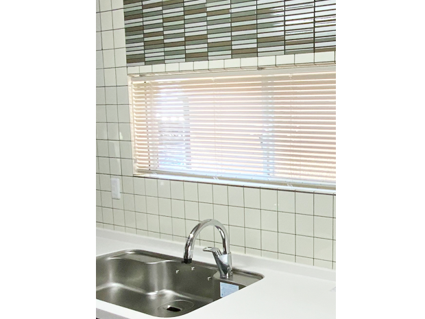 既設タイル壁は奥様のお気に入りのためそのまま残し、撤去した吊り戸棚の場所に新しく緑のタイルを設置することにしました。LIXIL名古屋ショールームにてご夫婦で決めた選りすぐりのタイルです。