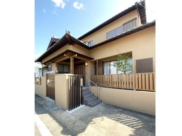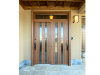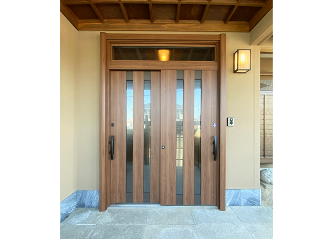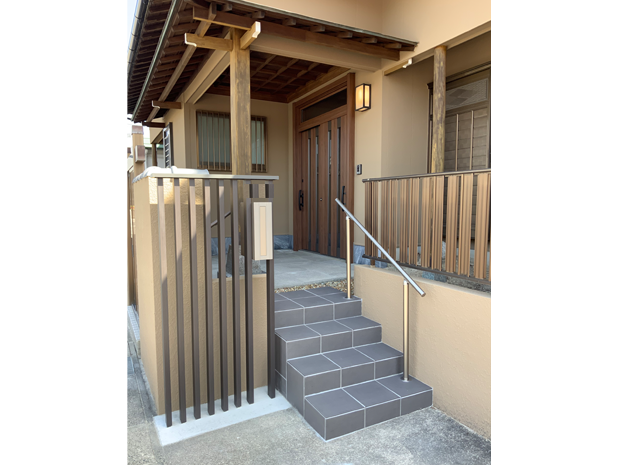 大規模リフォームの一環で外壁塗装と玄関も新しくしました。外壁の色は緑がかったカラーからやさしい茶色に。玄関はリフォーム前の欄間ありの引戸デザインはそのままに、趣深い和風の雰囲気は残しつつ、外壁と合う玄関扉の木目色「クリエモカ」をご選定頂きました。引戸の把手はつかみやすいタイプを採用されましたので、どんな世代の方でも使いやすく開け閉めもラクラクです。また、玄関ポーチへ向かう階段を新設しています。駐車場からの導線がスムーズになっただけでなく、手すりをつけたことによって階段の移動も安心です。その他工事を含め工期は2ヵ月半、費用は1000万円~となりました。