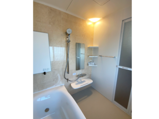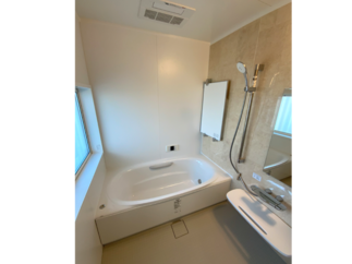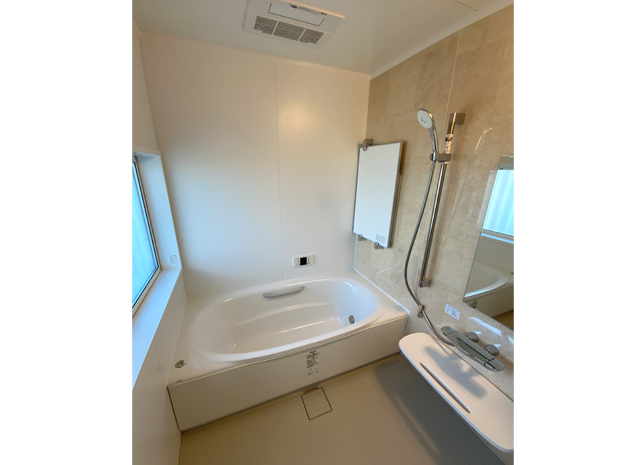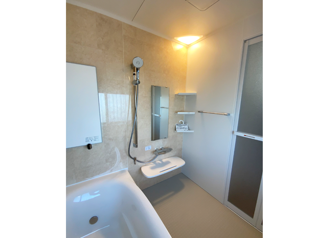 浴室はコーナーパネルライトがおしゃれな雰囲気を演出してくれています。浴室暖房も付け、温かく心地よいバスタイムを過ごすことができるようになりました。