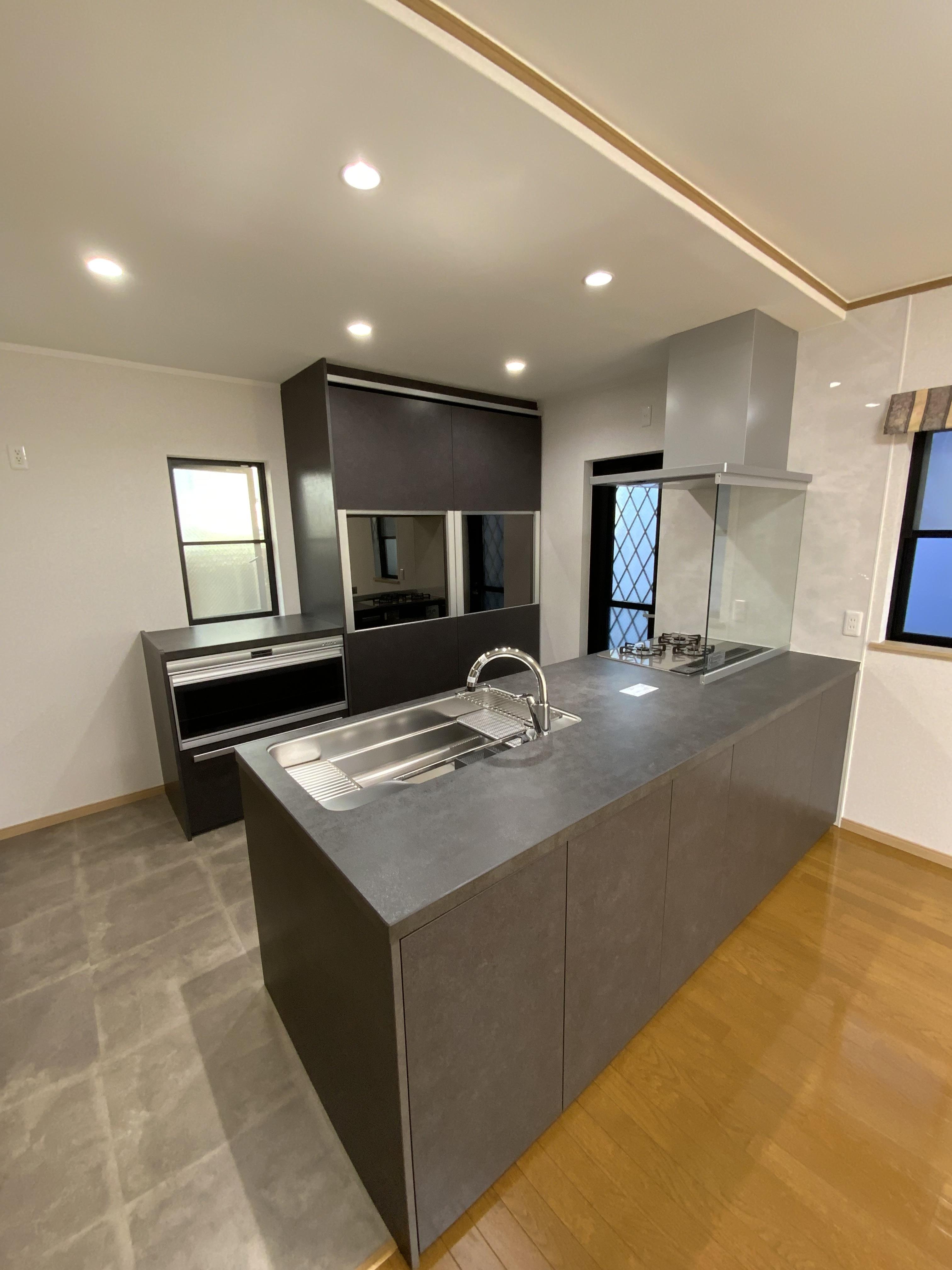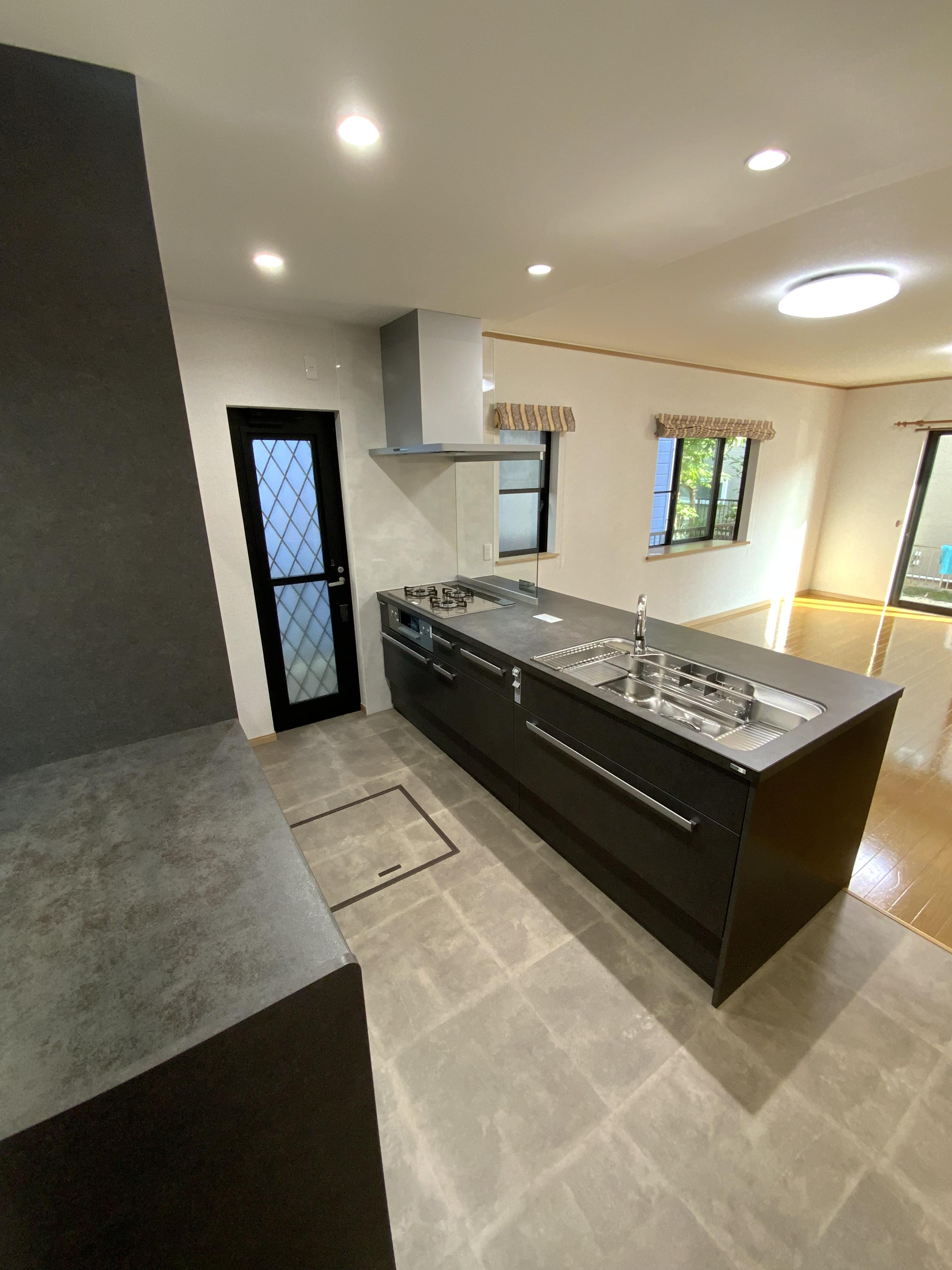 吊戸棚や垂壁で閉鎖的になりがちだったキッチンを思い切ってなくし開放的な印象に。更にLIXIL最高級グレードの「リシェルSI」でスタイリッシュにリフォームされました。リシェルSIの一番人気の色「グレーズグレー」とフロアタイルで統一感あるキッチンをダウンライトがスマートに照らしてくれます。