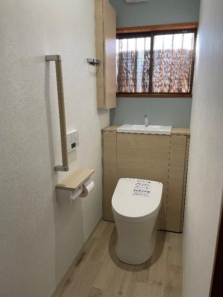 浴室はTOTO「サザナ」に。柔らかい床は優しく、お湯も冷めにくく、お手入れもしやすくなっています。お施主様ご希望のTOTOのトイレ「レストパル」は「プレミストキレイ除菌水」によって汚れがつきにくいため便器を清潔に保ちやすく、汚れがつきにくく落ちやすい防汚技術「セフィオンテクト」でさらにお掃除もらくらくです。