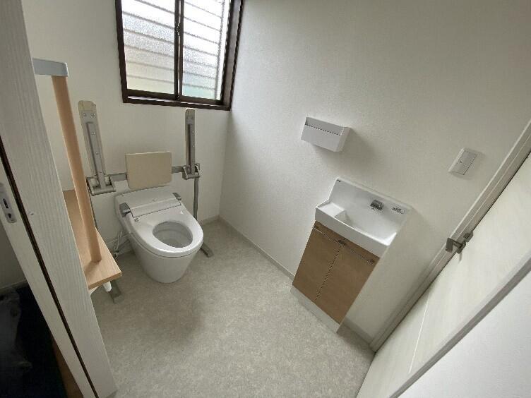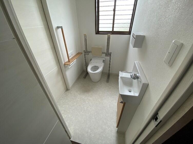 これからの動線を考え、段差をなくし寝室からも出入りできるように床の間のスペースを活用してトイレの入り口を増設、通常サイズの0.5坪から0.8坪へ広くし、ひじ掛け手すりや手洗いを別にし設置。万が一、車椅子になっても介護が必要になっても安心です。