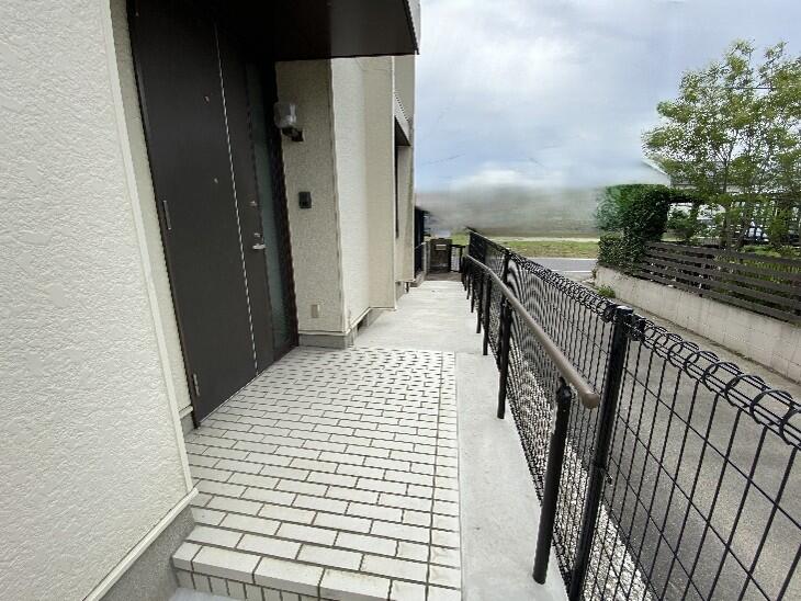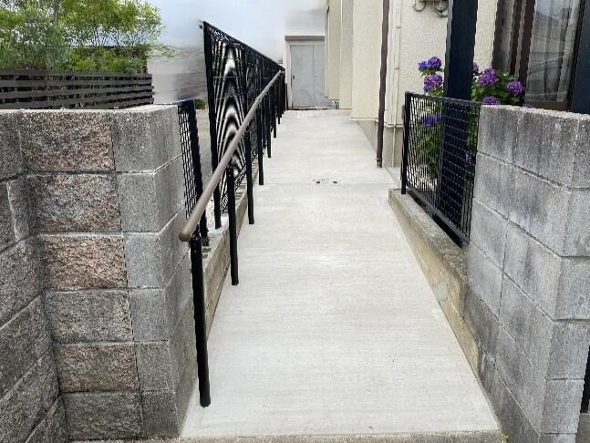 階段の昇り降りや凸凹のアプローチが歩行の不安になっていらしたお母さまのため、玄関まで樹脂手すりLIXIL「グリップライン」付きの緩やかなスロープにし、お母さまもにっこりの安心な動線になりました。 また家の周りをぐるっと防草シートと花崗岩砂利を敷き詰めたので、防犯対策だけでなく、雑草のお手入れも楽になりました。 お友達も安心してお招きできるアプローチを喜んで頂きました。