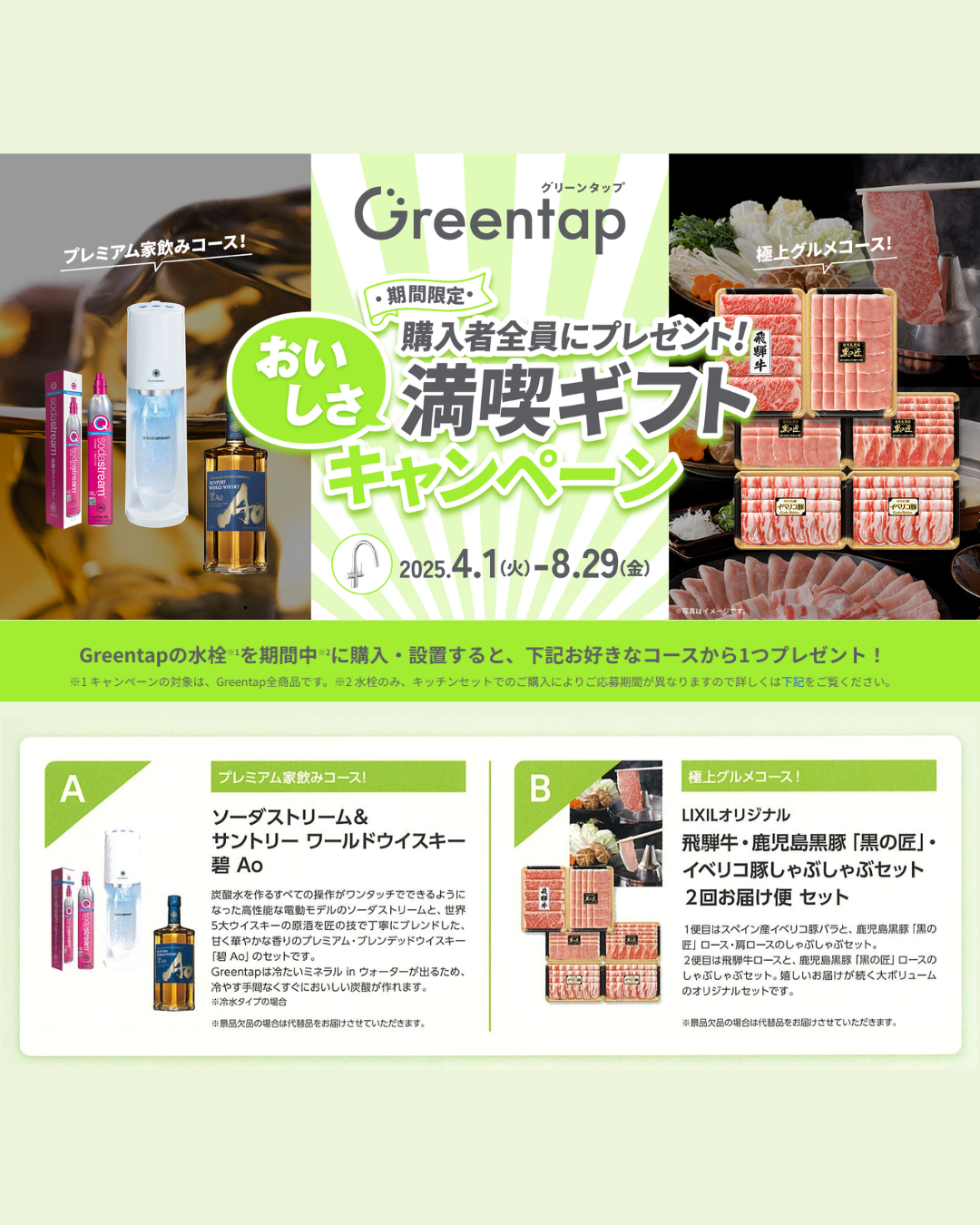 Greentapの水栓を期間中に購入・設置すると、下記お好きなコースから1つプレゼント!